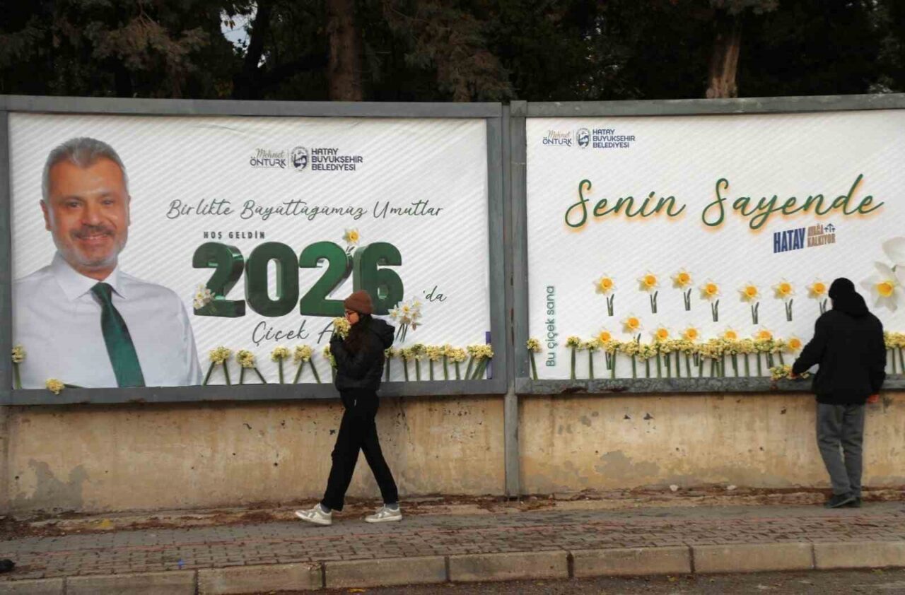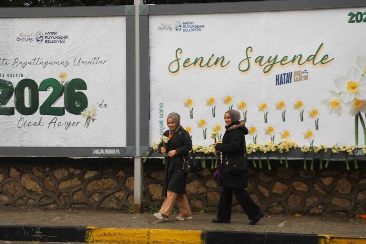 Hatay Büyükşehir Belediyesi (HBB), 6 Şubat 2023’te yaşanan deprem sonrası çok zor şartlar altında yaşamalarına rağmen tam bir birlik, beraberlik ve dayanışma örneği göstererek hayata tutunan ve şehrin kalkınmasına destek veren Hatay halkına minnettarlığını göstermek adına farklı bir etkinliğe imza attı. HBB ekipleri, şehrin farklı noktalarındaki billboardlarda HBB Başkanı Mehmet Öntürk’ün, “Birlikte Büyüttüğümüz Umutlar 2026’da Çiçek Açıyor” yazılı tebrik mesajlarının olduğu görsellerin üzerine Hataylı vatandaşlara yılbaşı hediyesi olarak demet demet nergis çiçekleri yerleştirdi.