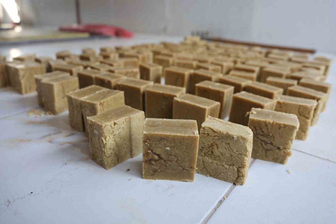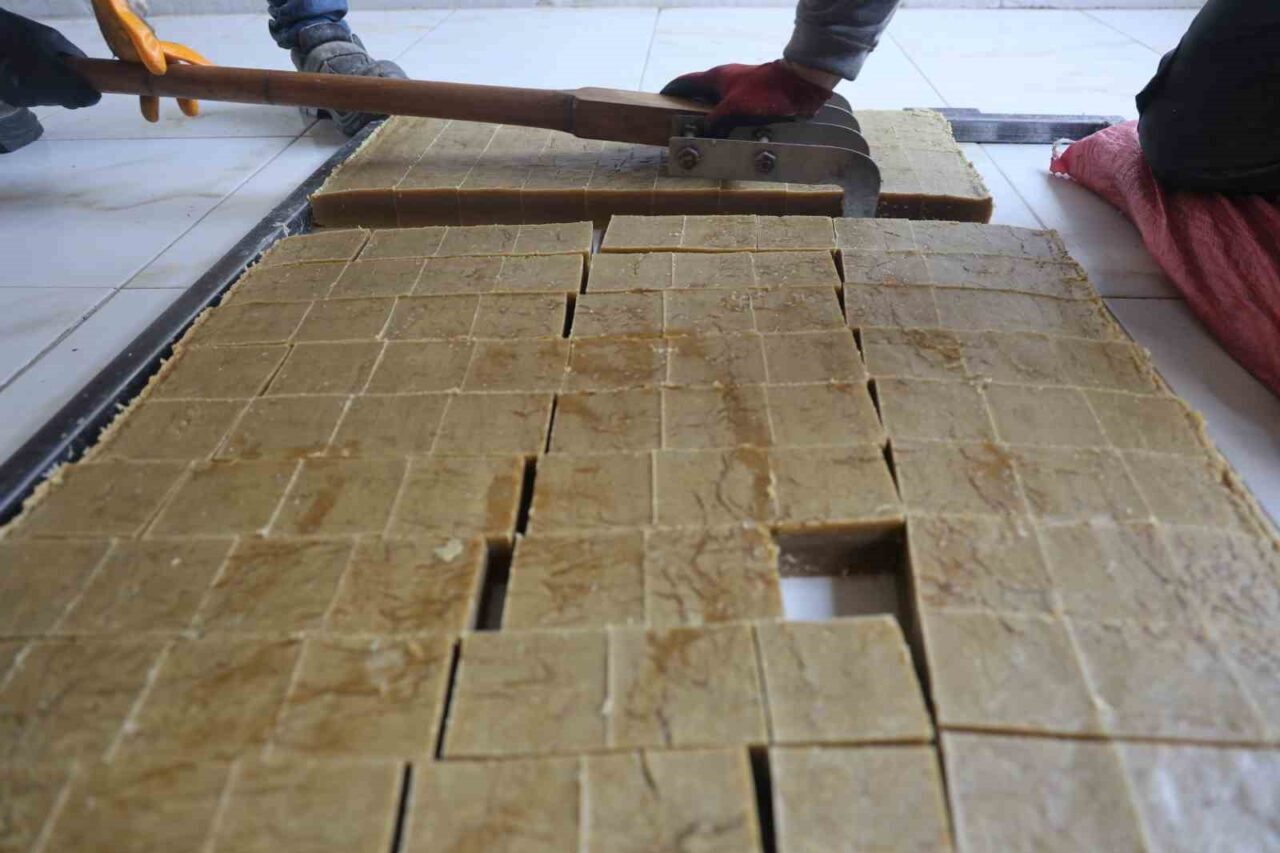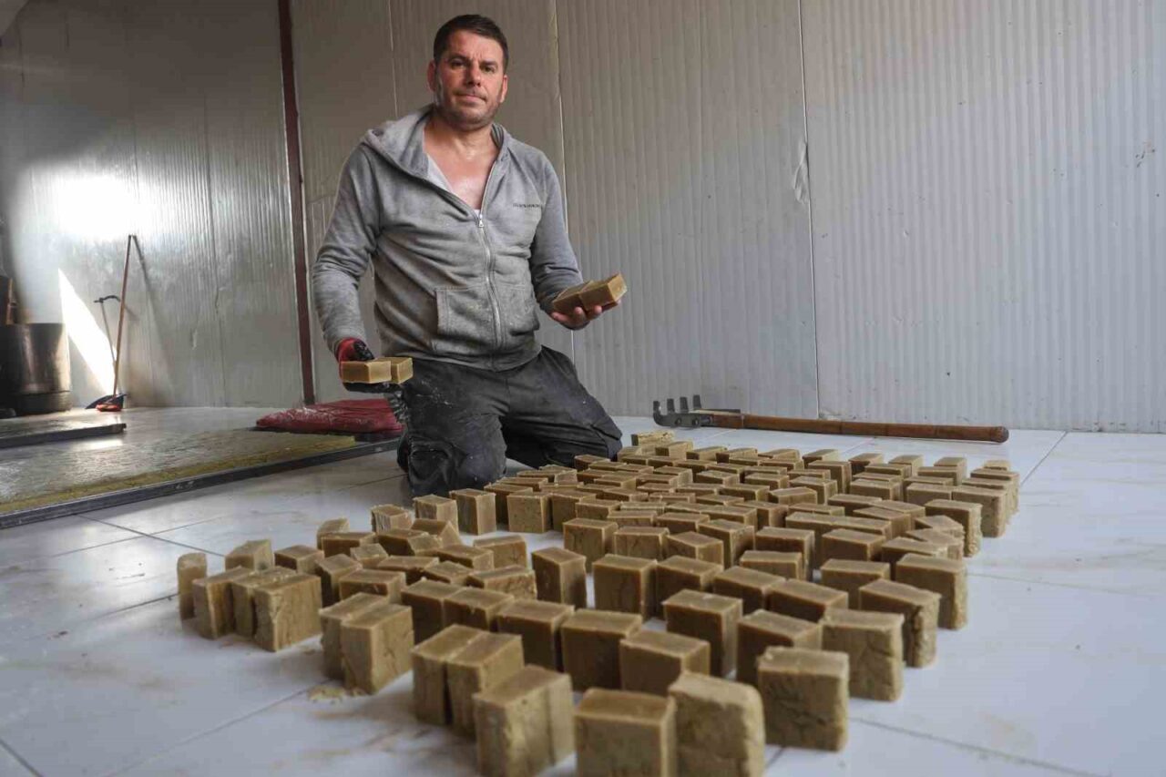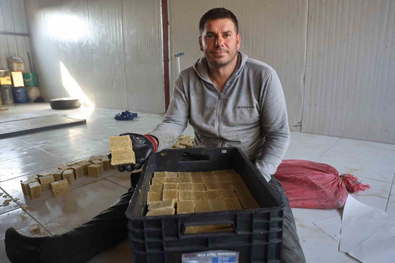 Hatay’da, babasından devraldığı sabun üretim işini tam 30 yıldır sürdüren Özcan Kaya, bölge halkının tercih ettiği ve cilde pek çok faydası bulunan zeytinyağlı defne sabunu üretimi için hummalı bir çalışma yürütüyor.
