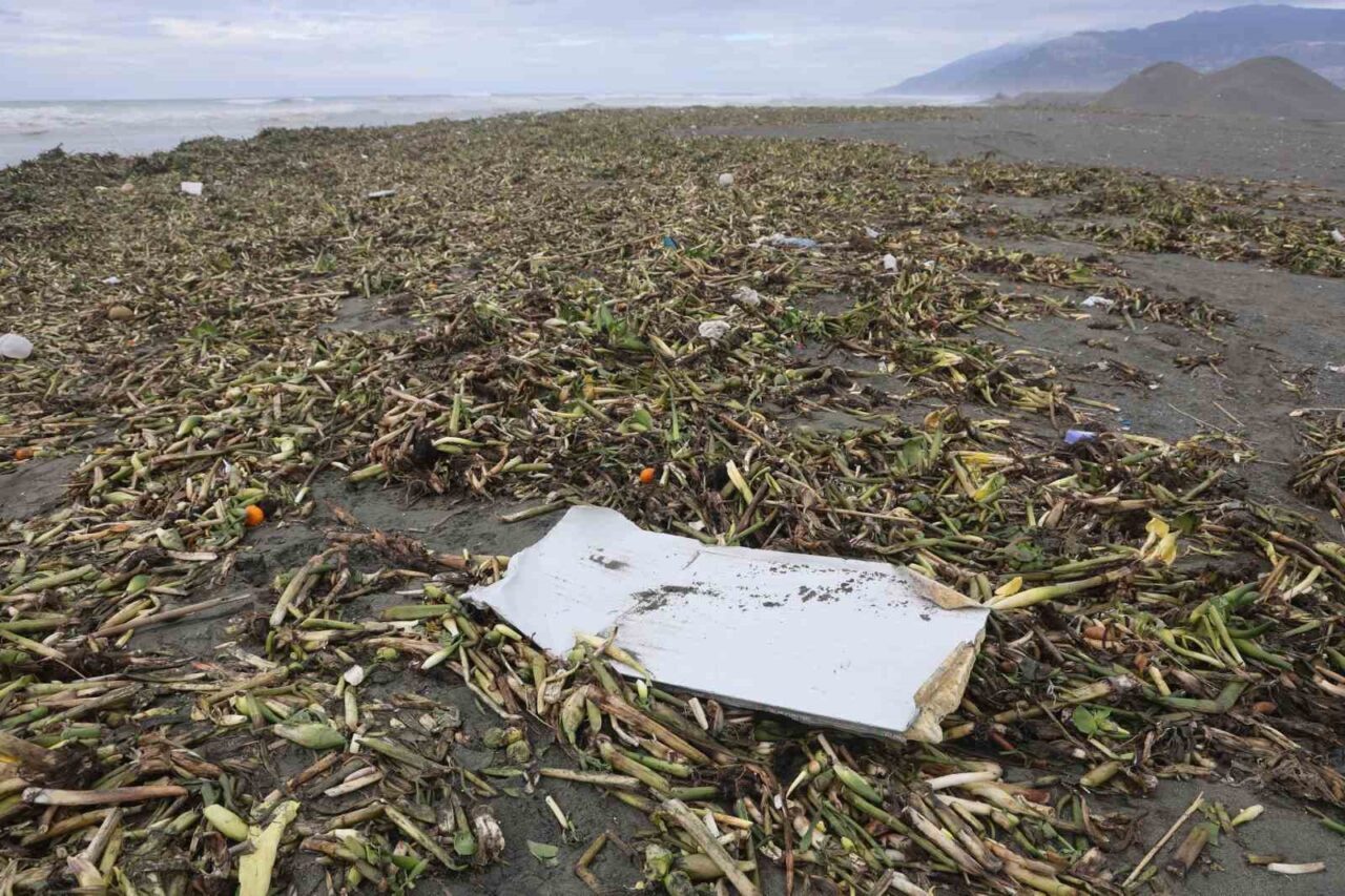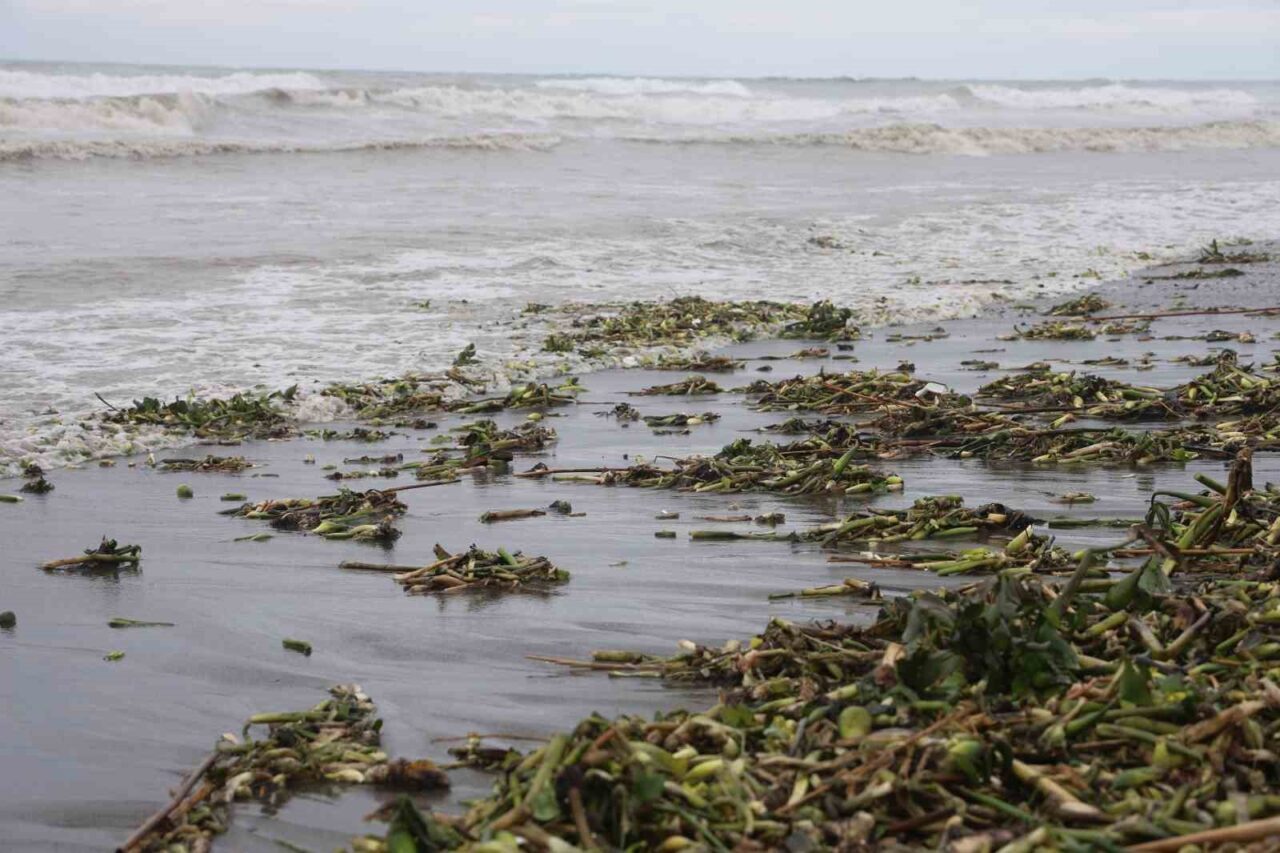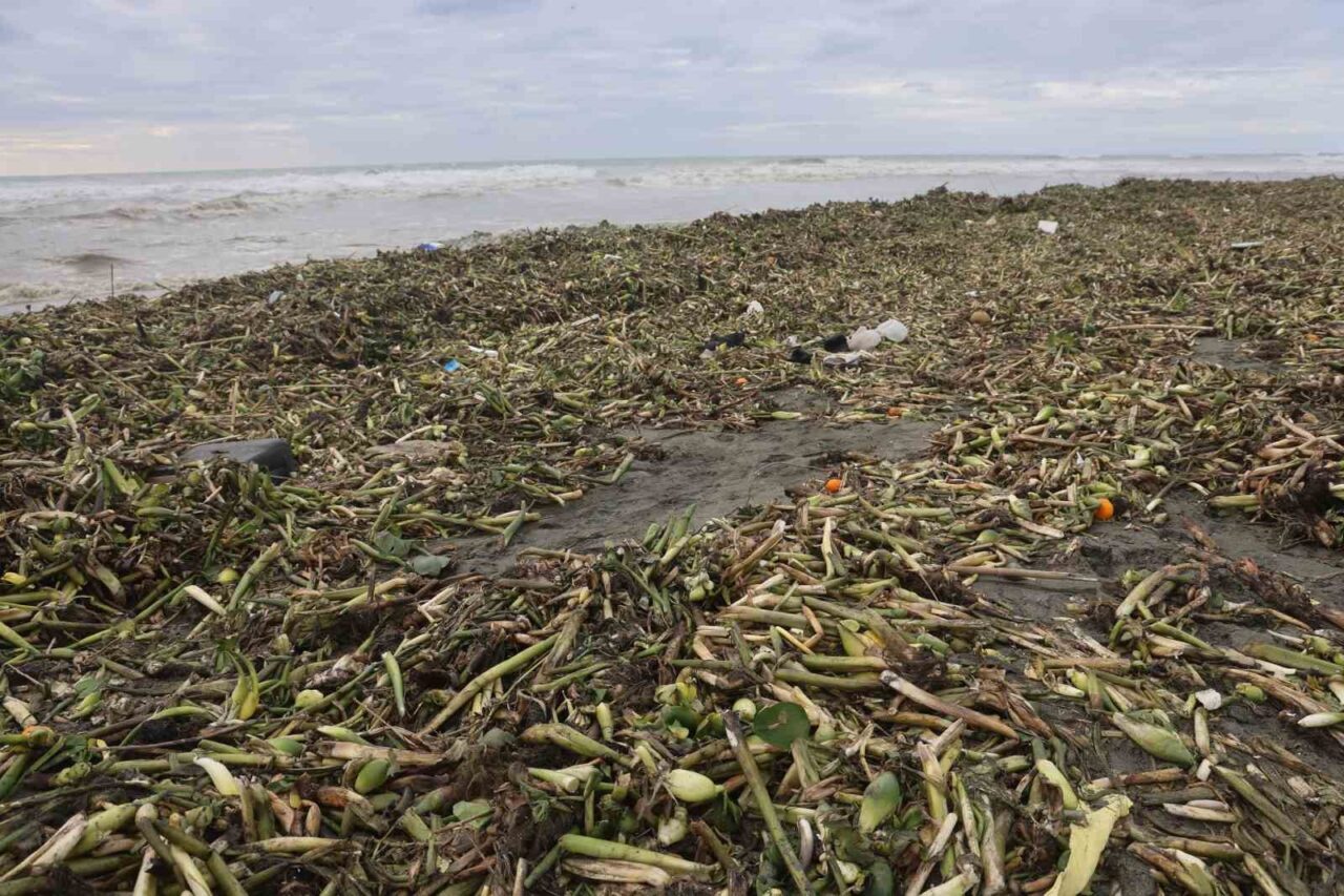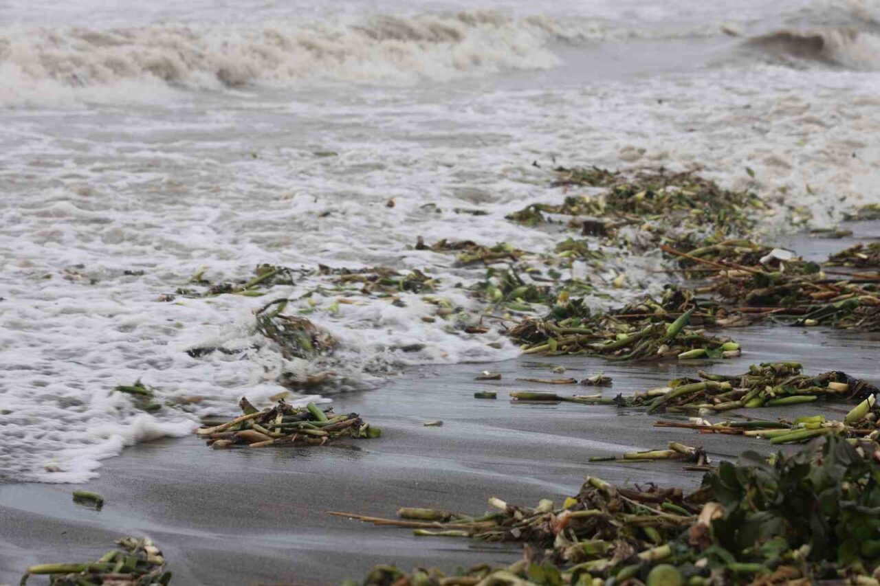 Hatay’da yaz aylarında Asi Nehri’ni kaplayan istilacı su sümbülleri, kentte etkili olan şiddetli fırtına ve yağışla birlikte Akdeniz’e döküldü. Denizdeki dalgaların kıyıya vurduğu su sümbülleri, Samandağ sahilini yeşile büründü.