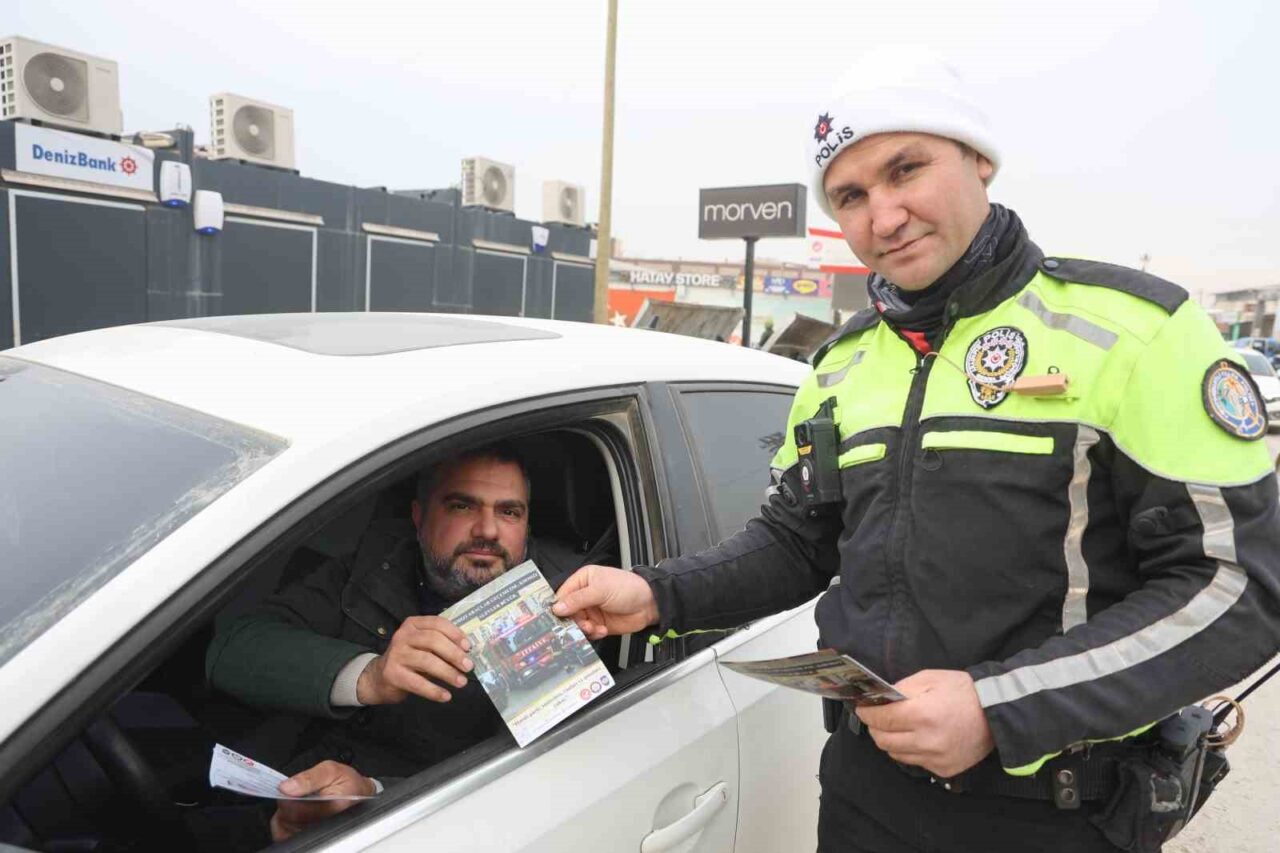 Hatay’da polis ekipleri, sürücüleri hatalı park yapmamaları konusunda bilgilendirerek broşürler dağıttı.