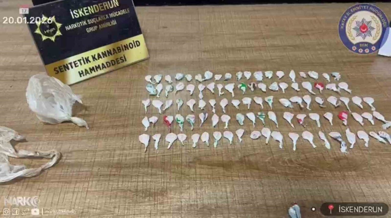Hatay Emniyet Müdürlüğü tarafından uyuşturucu madde kullanımının ve ticaretinin önlenmesine yönelik yürütülen çalışmalar kesintisiz devam ediyor. Bu çalışmalar kapsamında 20 Ocak günü İskenderun ilçesinde fiziki takip sonrası durdurulan A.E.Z. ve E.K.’nın üstünde ve A.E.’nin Esentepe Mahallesi’ndeki ikametinde arama yapıldı. Yapılan aramada; 0,30 gram sentetik kannabinoid ham maddesi, 98 parça halinde satışa hazır durumdaki sentetik kannabinoid ham maddeleri ve 0,80 gram sentetik kannabinoid maddesi ele geçirildi. Olayla ilgili olarak yakalanan A.E.Z. ve E.K. isimli şahıslara, TCK 191’den işlem yapıldı ve serbest bırakıldı. Adli makamlara sevk edilen şahıslardan S.E. adli kontrol şartıyla serbest bırakılırken, A.E. ise tutuklanarak cezaevine gönderildi. Ayrıca, arama yapılan Esentepe Mahallesi’ndeki ikametin 10 metre mesafesinde, taşın altındaki satışa hazır uyuşturucu madde polis ekiplerinin dikkati sayesinde bulundu.