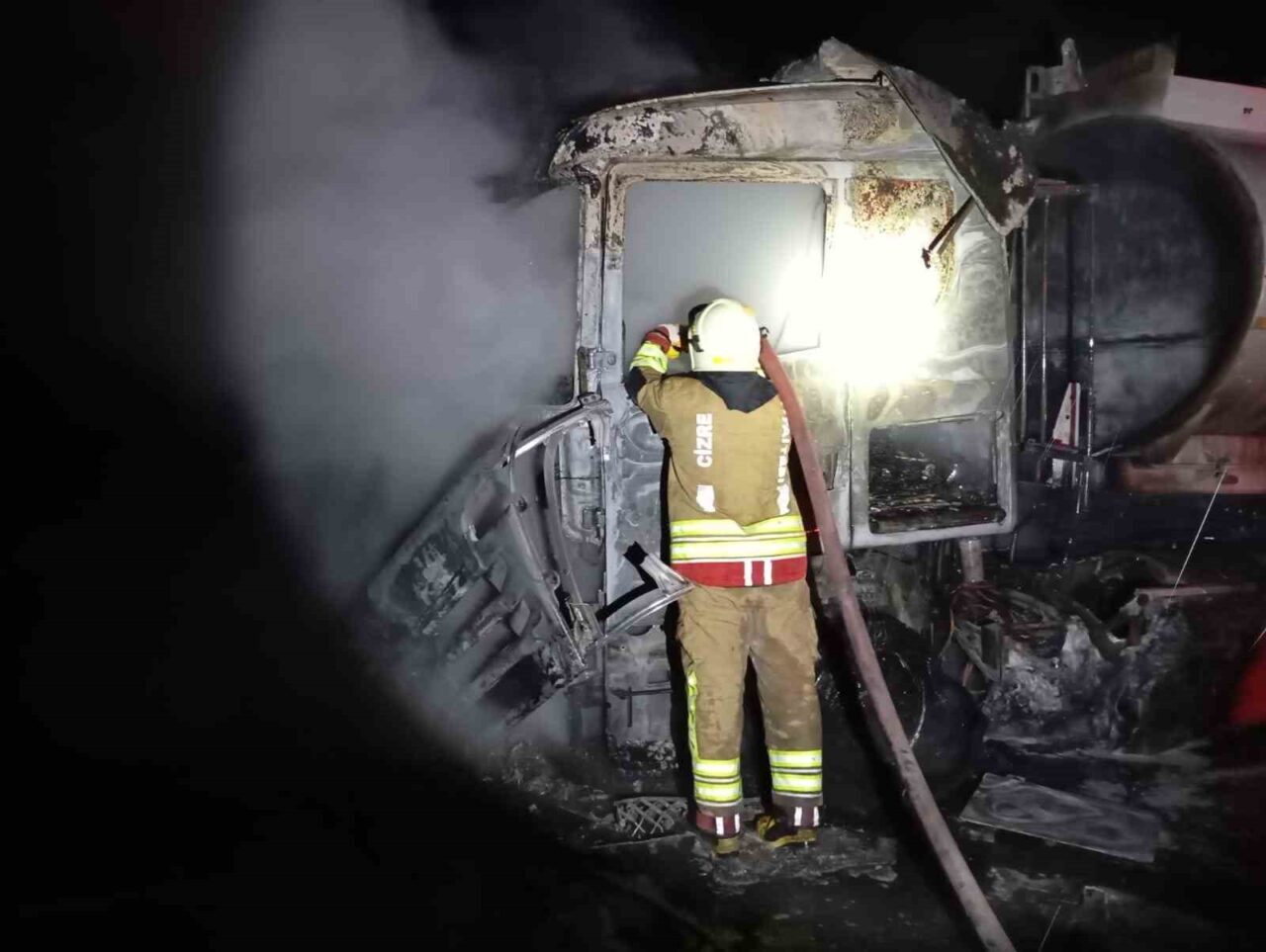 Şırnak’ın İdil ilçesinde meydana gelen olayda, seyir halinde olan bir tır alev aldı ve kullanılamaz hale geldi.