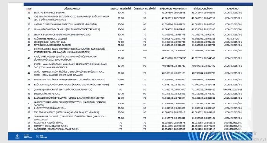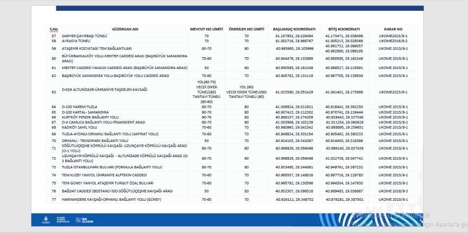 İSTANBUL’DA ÖNEMLİ ULAŞIM NOKTALARINDA HIZ LİMİTİ DEĞİŞTİ. UKOME KARARIYLA, AVRUPA YAKASI’NDA 57, ANADOLU YAKASI’NDA İSE 27 GÜZERGÂHIN HIZ SINIRLARI GÜNCELLENDİ. BUNA GÖRE D100 KARAYOLU BÜYÜKÇEKMECE TÜYAP’TAN ALTUNİZADE KÖPRÜLÜ KAVŞAĞI ARASINDA SAATTE 80 KİLOMETRE OLAN HIZ LİMİTİ 90’A ÇIKARILDI.