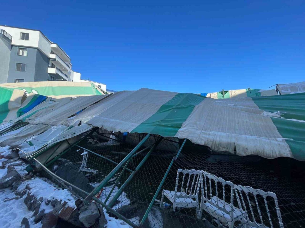 Iğdır’ın Tuzluca ilçesinde düğün salonu olarak hizmet veren halı saha, günlerdir etkili olan kar yağışının ardından çöktü. Olay anında içeride kimsenin olmaması, muhtemel bir faciayı engelledi.