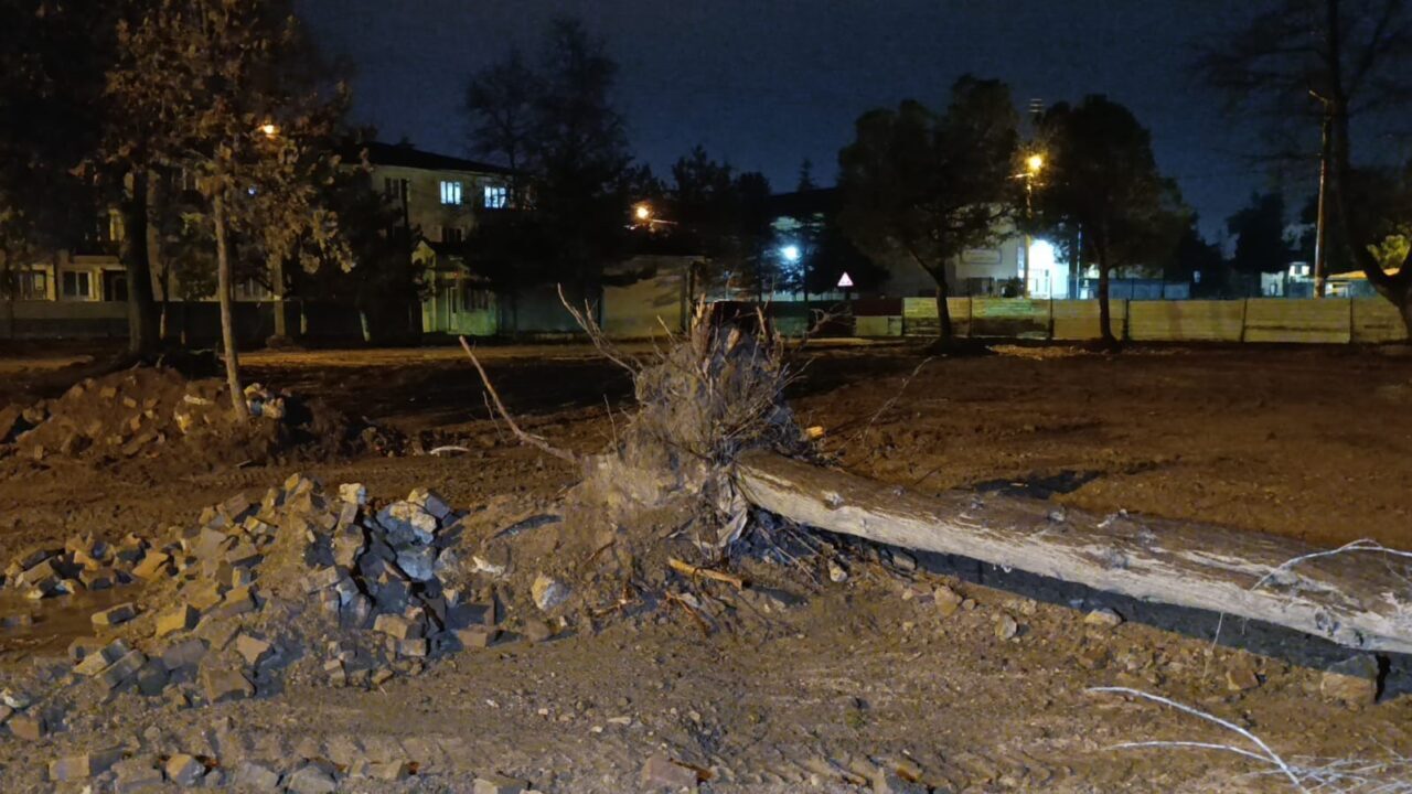 Bursa’nın İnegöl ilçesinde bir inşaat alanında bulunan ağaç, yağış ve rüzgarın etkisiyle kökünden çıkarak yola devrildi.
