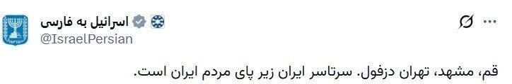İsrail Dışişleri Bakanlığı’na ait “IsraelPersian” adlı X hesabından yapılan Farsça paylaşımda İran’daki protestolara destek verilerek, “Kum, Meşhed, Tahran, Dezful; İran’ın tamamı İran halkınındır” ifadeleri kullanıldı. Hesabın, kitlesel gösterilere ait birçok görüntüyü yeniden paylaşması da dikkat çekti.