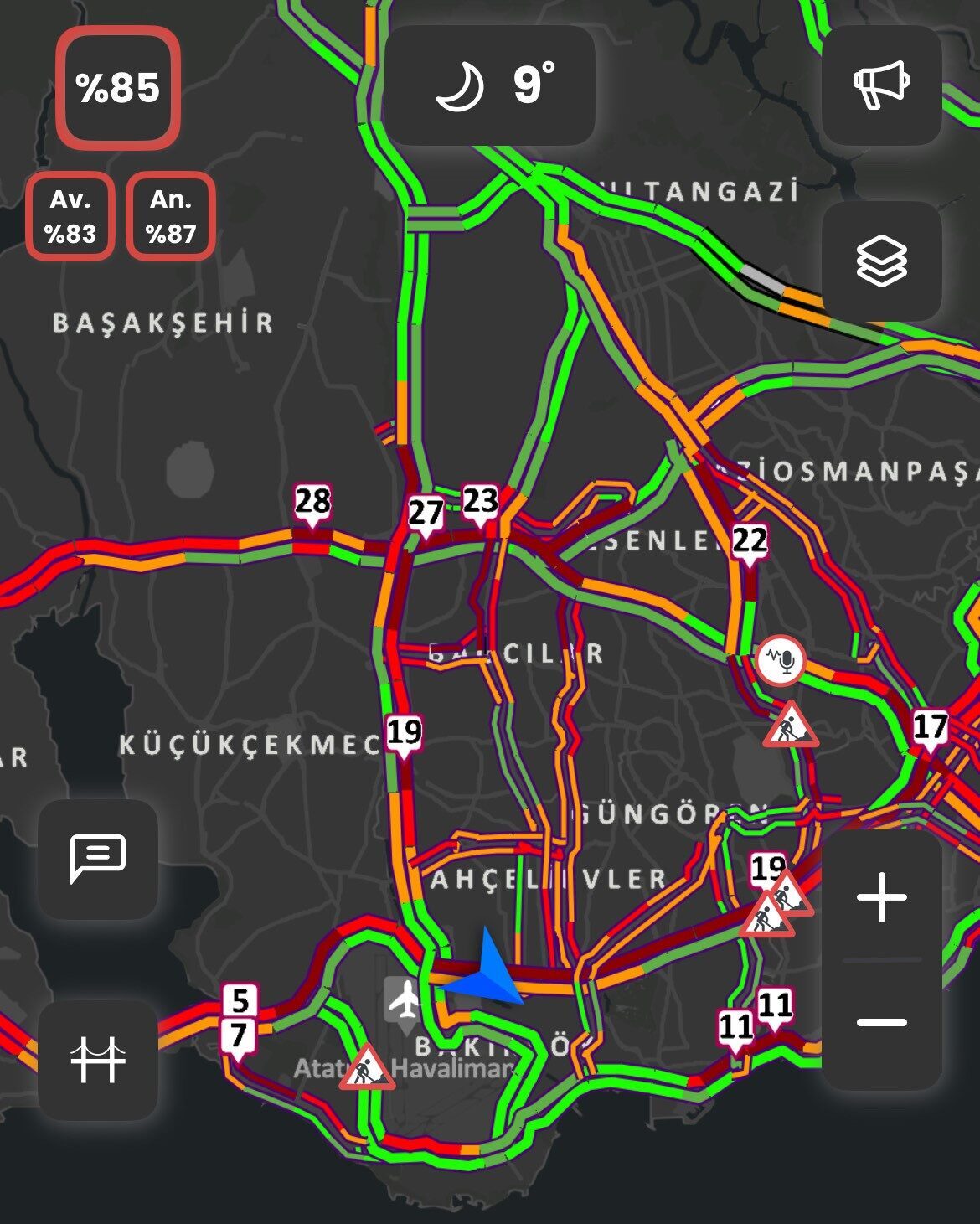 İstanbul Büyükşehir Belediyesi’nin Trafik Yoğunluğu Haritası’na dayanan verilere göre, akşam saat 18.55 itibarıyla trafik yoğunluğu yüzde 85 seviyelerine ulaştı. Özellikle Yenibosna E-5 Karayolu üzerinde, araçların hareket etmesinde büyük zorluklar yaşanırken, uzun araç kuyrukları da gözlemlendi.