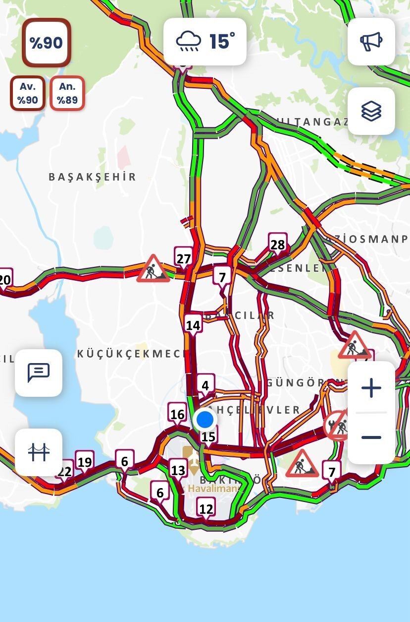 Akşam iş çıkış saatlerinde, İstanbul’daki trafik yoğunluğu %90 seviyelerine ulaştı. İstanbul Büyükşehir Belediyesi (İBB) Cep Trafik verilerine göre, Avrupa Yakası’nda 18.05 itibarıyla bu yüksek yoğunluk kaydedildi. D-100 Karayolu’nun Zeytinburnu Cevizlibağ bölgesi, en yoğun trafiğin yaşandığı noktalar arasında yer aldı. Sürücüler, işten çıkarken uzun araç kuyruklarıyla karşılaştılar ve bu durum bazı bölgelerde trafiğin tamamen durmasına neden oldu.