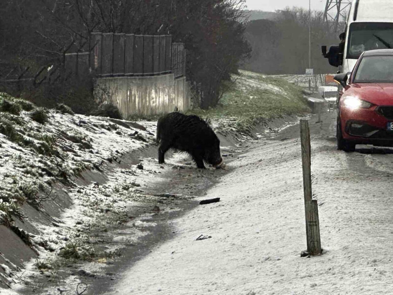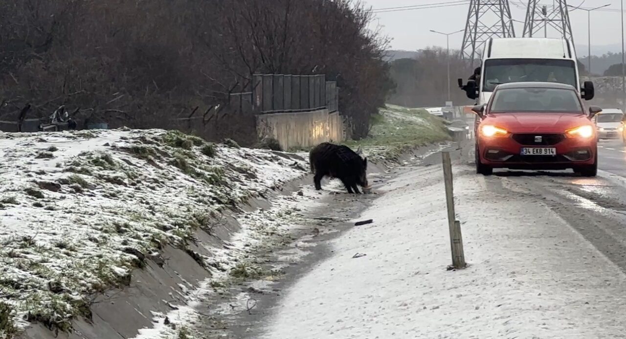 İstanbul’da etkili olan soğuk hava ve aralıklarla görülen kar yağışı, yaban hayatını olumsuz yönde etkiledi. Yiyecek bulmakta zorlandığı düşünülen bir yaban domuzu, Hasdal-Kemerburgaz yoluna indi. Yol kenarında bir süre yiyecek yiyen domuz, vatandaşların ilgisini çekti. Bu anlar, yoldan geçen bazı sürücüler tarafından cep telefonu kamerası ile kaydedildi. Bir süre yol kenarında kalan domuz, daha sonra ormanlık alana girerek gözden kayboldu.