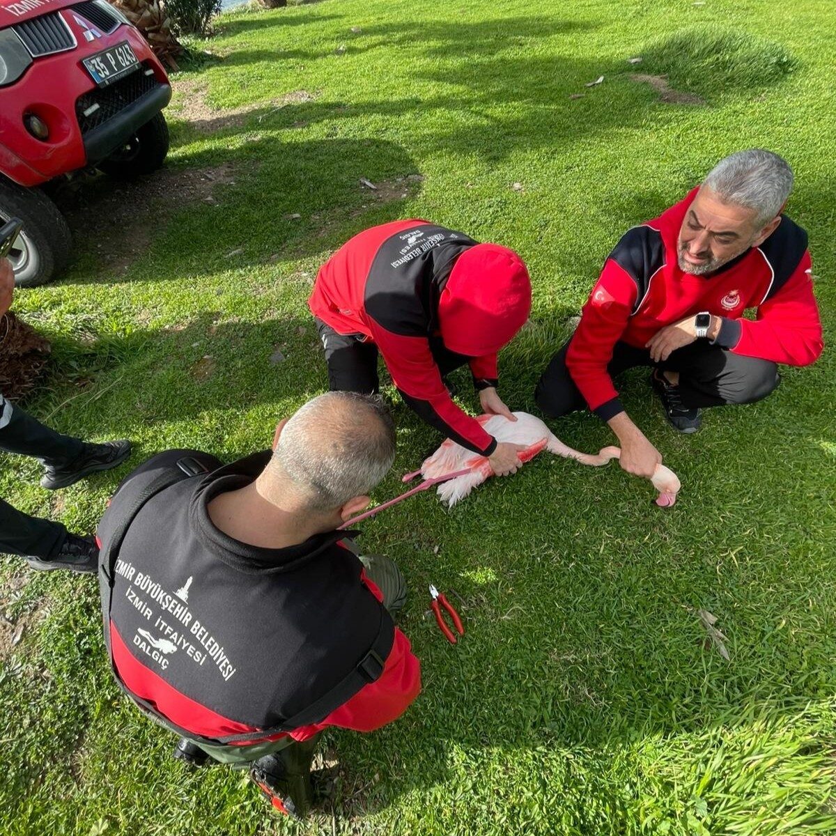 İtfaiye dalgıçlarından oluşan 4 kişilik uzman ekip, flamingonun bulunduğu alanda kurtarma çalışması başlattı. Denizde ve kıyı hattında yürütülen dikkatli ve kontrollü operasyon sonucunda flamingoya ulaşıldı. Ayağına dolanan misina nedeniyle hareket kabiliyeti kısıtlanan flamingo, bota alınarak güvenli bir şekilde karaya çıkarıldı. Ekipler, hayvana zarar vermeden misinayı çıkardı.