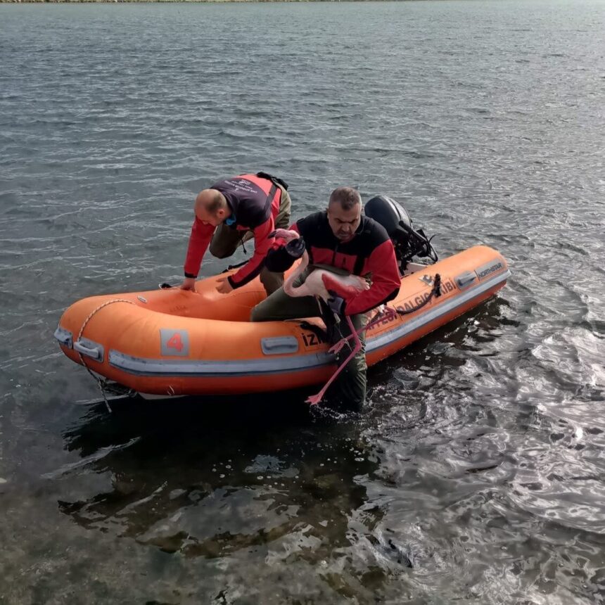İtfaiye dalgıçları, İnciraltı’nda ayağına misina dolanan bir flamingoyu başarılı bir çalışmayla kurtararak yeniden doğal ortamına kavuşturdu.