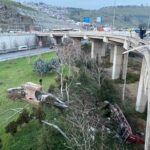 Çarpmanın etkisiyle otomobil köprüde asılı kalırken, kamyonun kasasındaki iş makinesi metrelerce yükseklikten aşağı düştü.