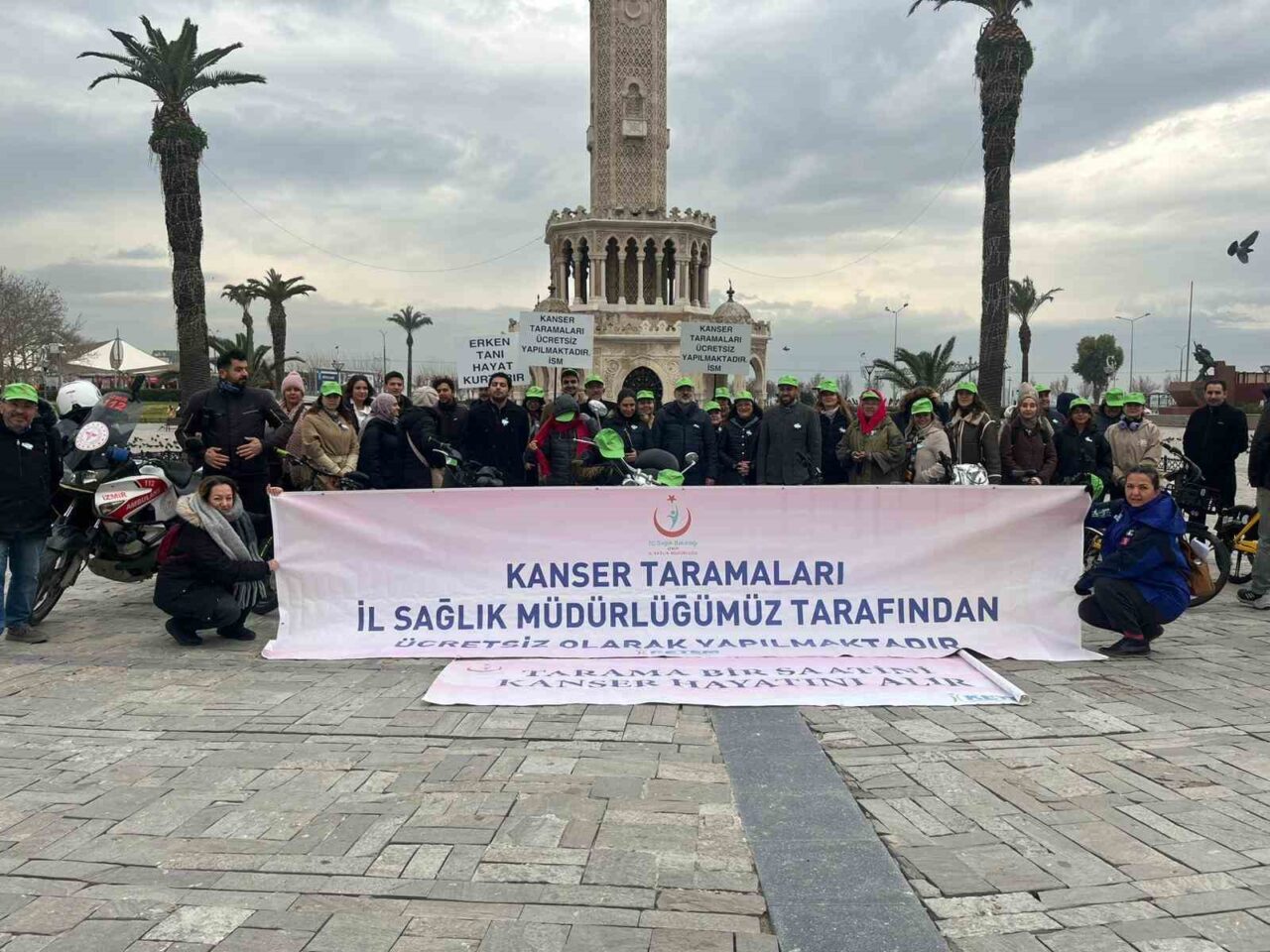 Katılımcılar, Konak’tan Alsancak Gündoğdu Meydanı’na kadar pedal çevirerek erken teşhisin önemine dikkat çekti.