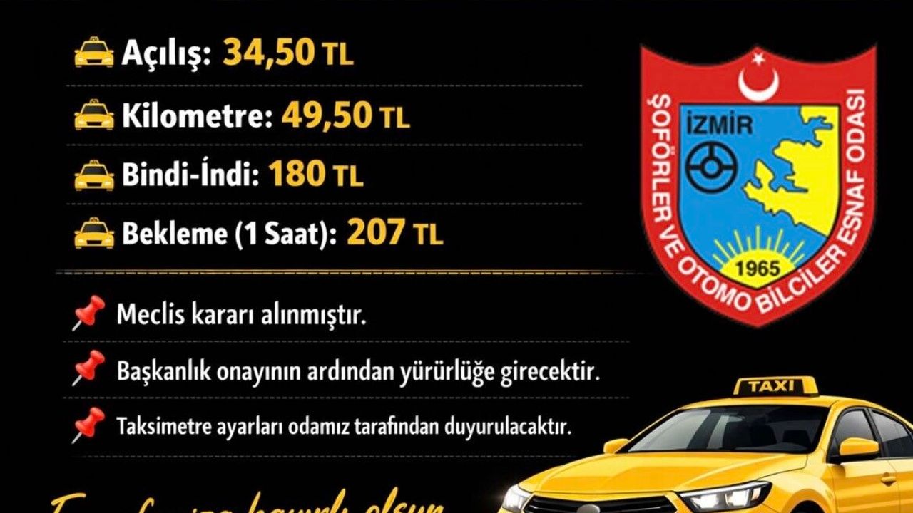 İzmir Büyükşehir Belediyesi meclisi, şehirdeki taksimetre ücret tarifesini güncelledi. Alınan karara göre, taksilerde bindi indi ücreti 180 lira olarak belirlendi. Meclisin gerçekleştirdiği toplantıda, taksi ücretlerinde artış yapılmasına karar verildi. Yeni tarifeye göre, taksilerin açılış ücreti 34 lira 50 kuruş, kilometre ücreti 49 lira 50 kuruş ve 1 saat bekleme ücreti ise 207 lira olarak belirlendi. Bu meclis kararının, önümüzdeki hafta başkanlık makamının onayının ardından yürürlüğe gireceği bilgisi verildi. İzmir Şoförler ve Otomobilciler Esnaf Odası Başkanı Erkan Özkan, süreçle ilgili açıklamalarda bulundu. Onay sürecinin tamamlanmasının ardından oda tarafından esnafa bilgilendirme yapılacağını belirten Özkan, taksimetre ayarlarının yeni tarifeye uygun şekilde düzenleneceğini ifade etti. Özkan, yeni tarifelerin tüm esnaf için hayırlı olmasını dileyerek, kazasız ve bol kazançlı çalışmalar temennisinde bulundu.