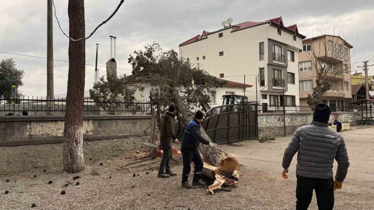 Bursa’nın İznik ilçesinde Mustafakemalpaşa Mahallesi’nde etkili olan şiddetli lodos, ilkokul ve ortaokulun ortak kullandığı okul bahçesinde bulunan büyük bir çam ağacının devrilmesine yol açtı. Ağaç, okul bahçesinin hemen yanındaki iki katlı bir evin çatısının üzerine düşerken, evde önemli hasar meydana geldi.
