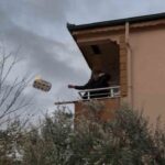Alevleri fark eden ev sahibi, yangının büyümesini önlemek amacıyla balkona çıkarak yanan eşyaları aşağı attı.