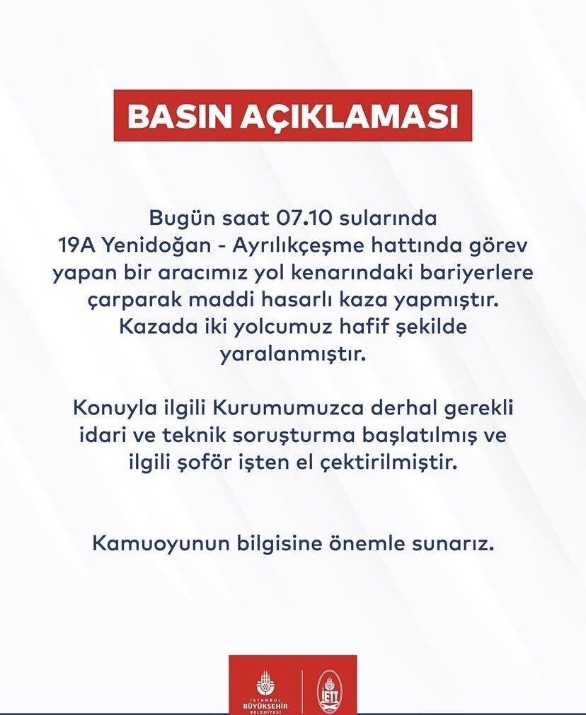 İETT tarafından yapılan açıklamaya göre, kaza 07.10 civarında gerçekleşti. 19A Yenidoğan – Ayrılıkçeşme hattında sefer yapan araç, yol kenarındaki bariyerlere çarptı. Bu talihsiz olay sonucunda iki yolcu hafif yaralandı.