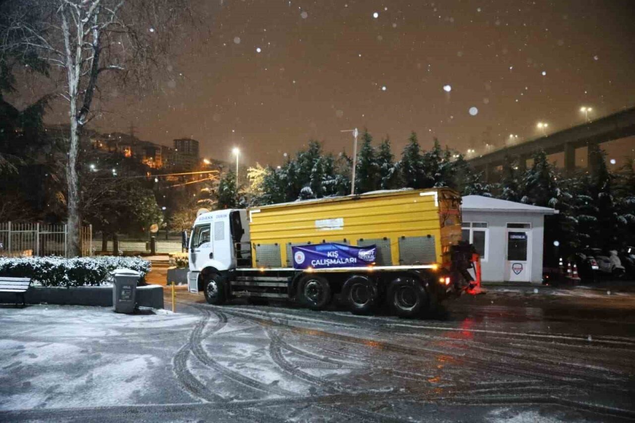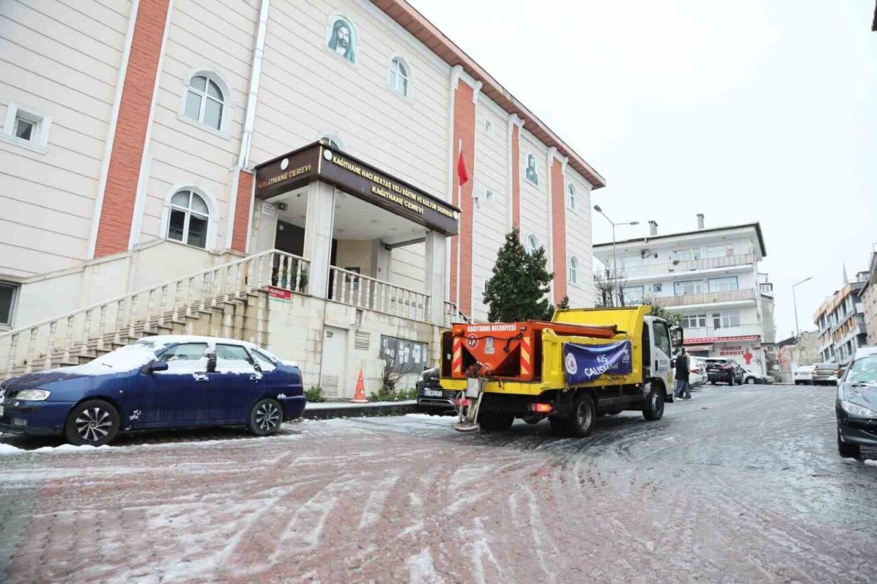 İstanbul genelinde etkili olan kar yağışına karşı Kağıthane’de belediye ekipleri, ilçe genelinde yolların açık kalması için 24 saat aralıksız görev yapıyor.