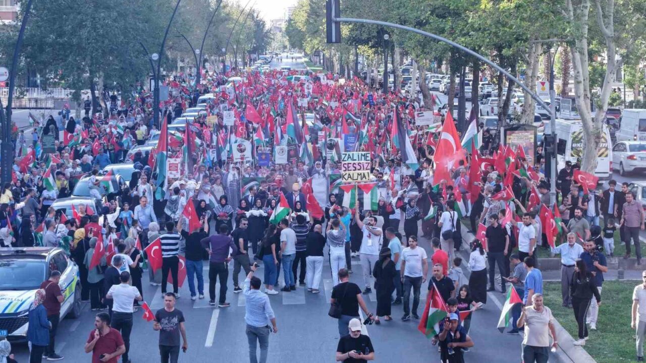 Alparslan Türkeş Bulvarı’nda bir araya gelen kalabalık, ellerinde Türk ve Filistin bayraklarıyla Necip Fazıl Kültür Merkezi’ne kadar yürüyüş yaptı. Bu etkinlikte, Büyükşehir Belediyesi tarafından katılımcılara bayraklar ücretsiz olarak dağıtıldı. Yürüyüş sırasında, ABD Başkanı Trump ve İsrail Başbakanı Netanyahu maske takan bazı bireyler, Filistinli çocuklara yönelik yapılan zulmü temsil eden kısa bir tiyatro gösterisi sahneledi. İsrail askerlerinin Filistinli çocuklara karşı uyguladığı şiddeti konu alan sahneler, yürüyüşe katılanların yoğun tepkisini topladı. “Kahrolsun İsrail” ve “Yaşasın özgür Filistin” sloganları yürüyüş boyunca atılırken, ara ara tekbir sesleri de yükseldi. Necip Fazıl Kültür Merkezi önünde gerçekleşen program, şiirlerin okunması, duaların edilmesi ve çeşitli konuşmaların yapılmasıyla sona erdi. Ayrıca etkinlik sonunda MADO, katılımcılara ikramlarda bulundu.