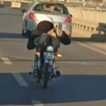 Kahramanmaraş’ın Onikişubat ilçesinde bir motosiklet sürücüsünün dikkat çekici ve tehlikeli yolculuğu, bir vatandaş tarafından cep telefonuyla kayda alındı.