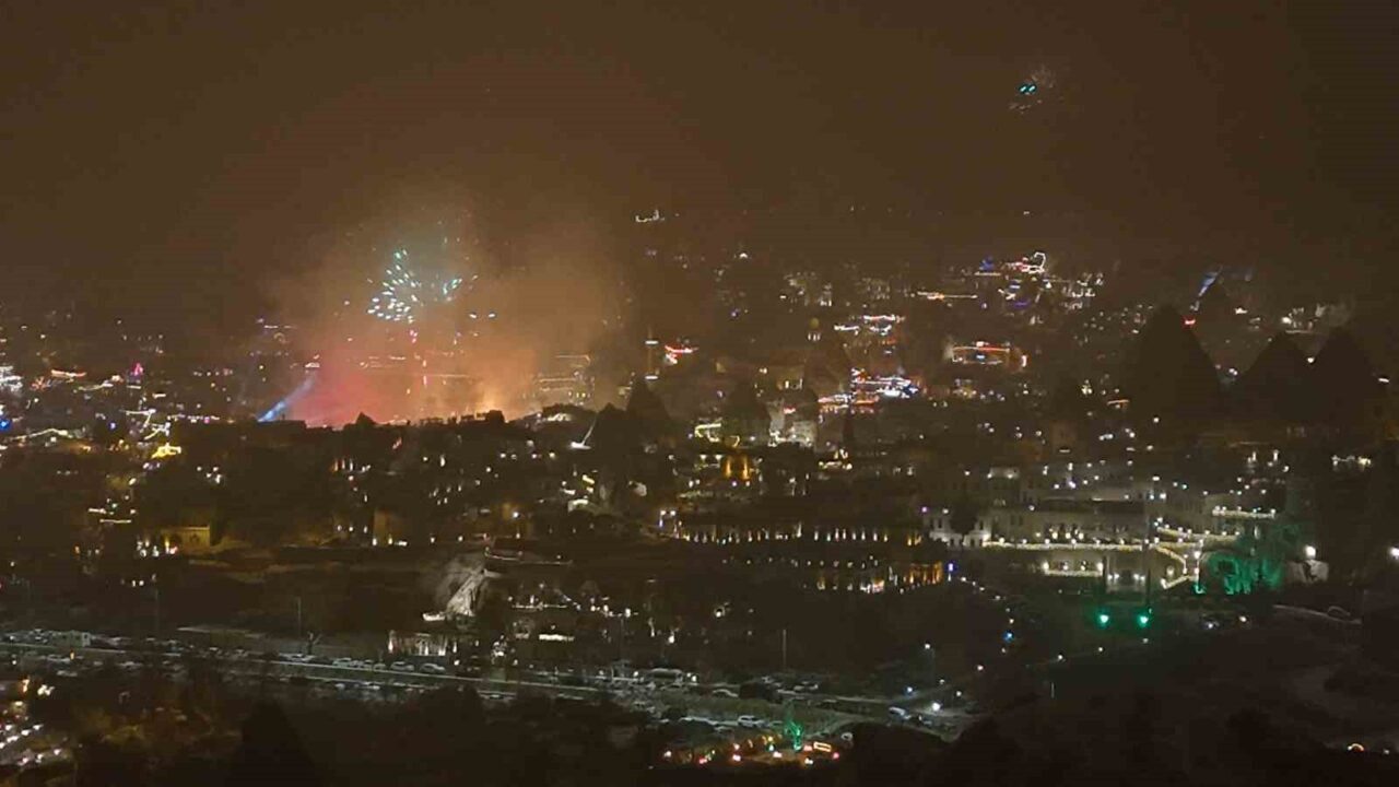 UNESCO Dünya Doğal ve Kültür Mirası Listesi’nde yer alan ve her yıl milyonlarca turist ağırlayan Kapadokya, bu yılbaşında da doldu. Bölgeye akın eden yerli ve yabancı turistler, yeni yıla saatler kala eğlence merkezlerine yöneldi. Görsel bir şölen oluşturan havai fişek gösterileri dron ile kaydedildi.
