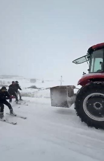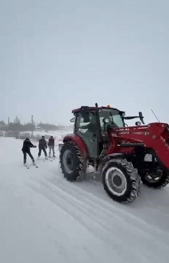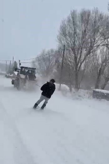 Kar yağışını fırsata dönüştüren gençler, soğuk havaya aldırış etmeden eğlenceli anlar yaşadı. Yoğun kar yağışının ardından beyaza bürünen bölgede bir araya gelen gençler, traktörün arkasına bağladıkları kayakla kayarak karın tadını çıkardı.