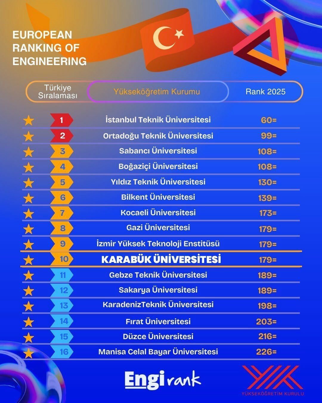 Karabük Üniversitesi (KBÜ), EngiRank 2025 değerlendirmeleri sonucunda Türkiye’deki en iyi 10 mühendislik üniversitesi arasında yer aldı. Ayrıca, Avrupa sıralamalarında 179. sırada konumlandı.