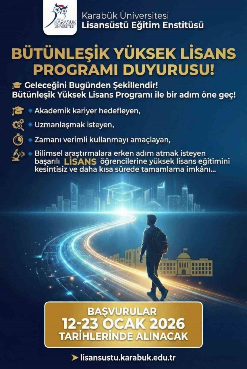 Karabük Üniversitesinde bütünleşik yüksek lisans programı için başvurular 12-23 Ocak 2026 tarihleri arasında alınacaktır.