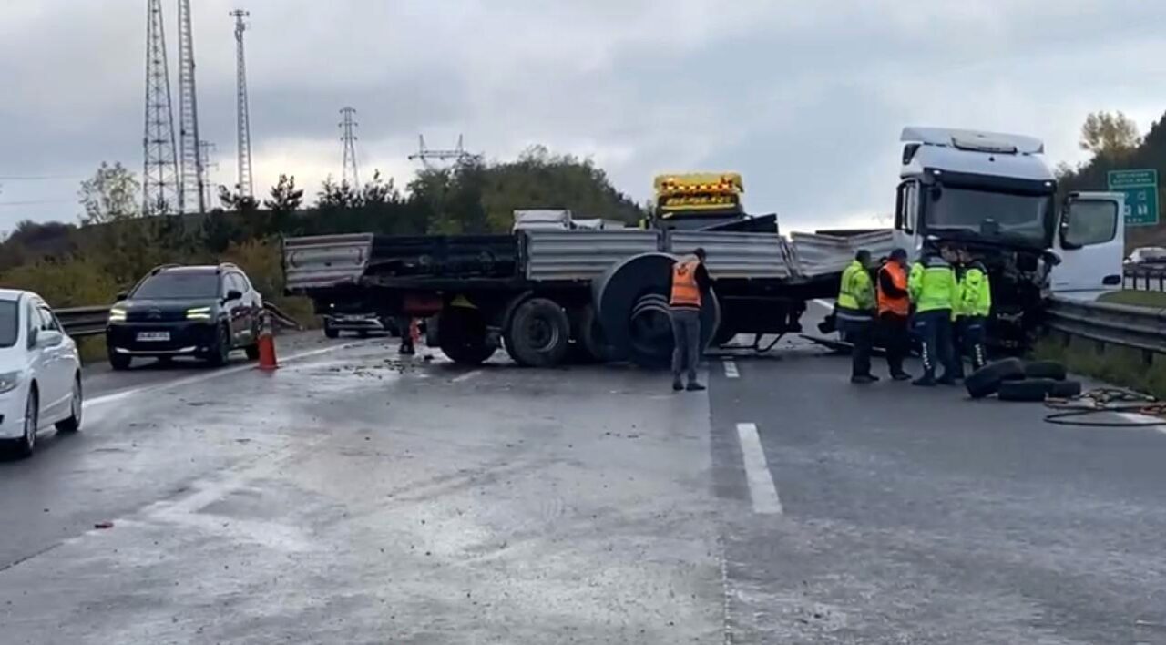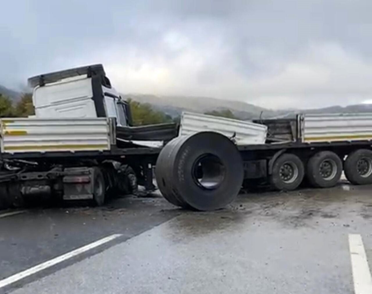 TEM OTOYOLU’NUN BOLU GEÇİŞİNDE BARİYERLERE ÇARPIP MAKASLAYAN TIRA ARKADAN GELEN BAŞKA BİR TIR ÇARPTI. KAZADA 1 KİŞİ YARALANDI