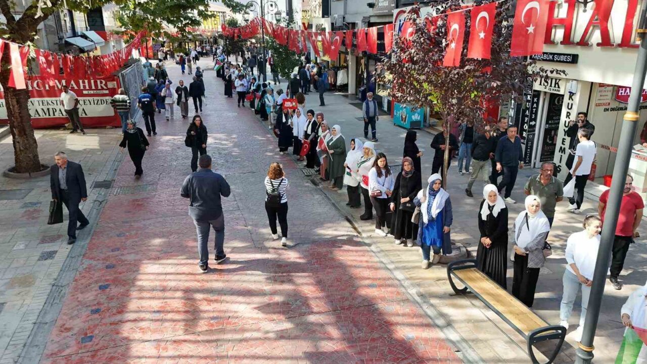 Kemal Güneş Caddesi’nde bir araya gelen kadınlar, Gazze’ye destek vermek amacıyla el ele tutuşarak sembolik bir zincir oluşturdular. Bu anlamlı etkinliğe, AK Parti İl Başkanı Ferhat Salt, Merkez İlçe Başkanı Yavuz Hüsam ve Yortan Belde Belediye Başkanı Yılmaz Tiryaki de katılarak kadınların yanında yer aldı.