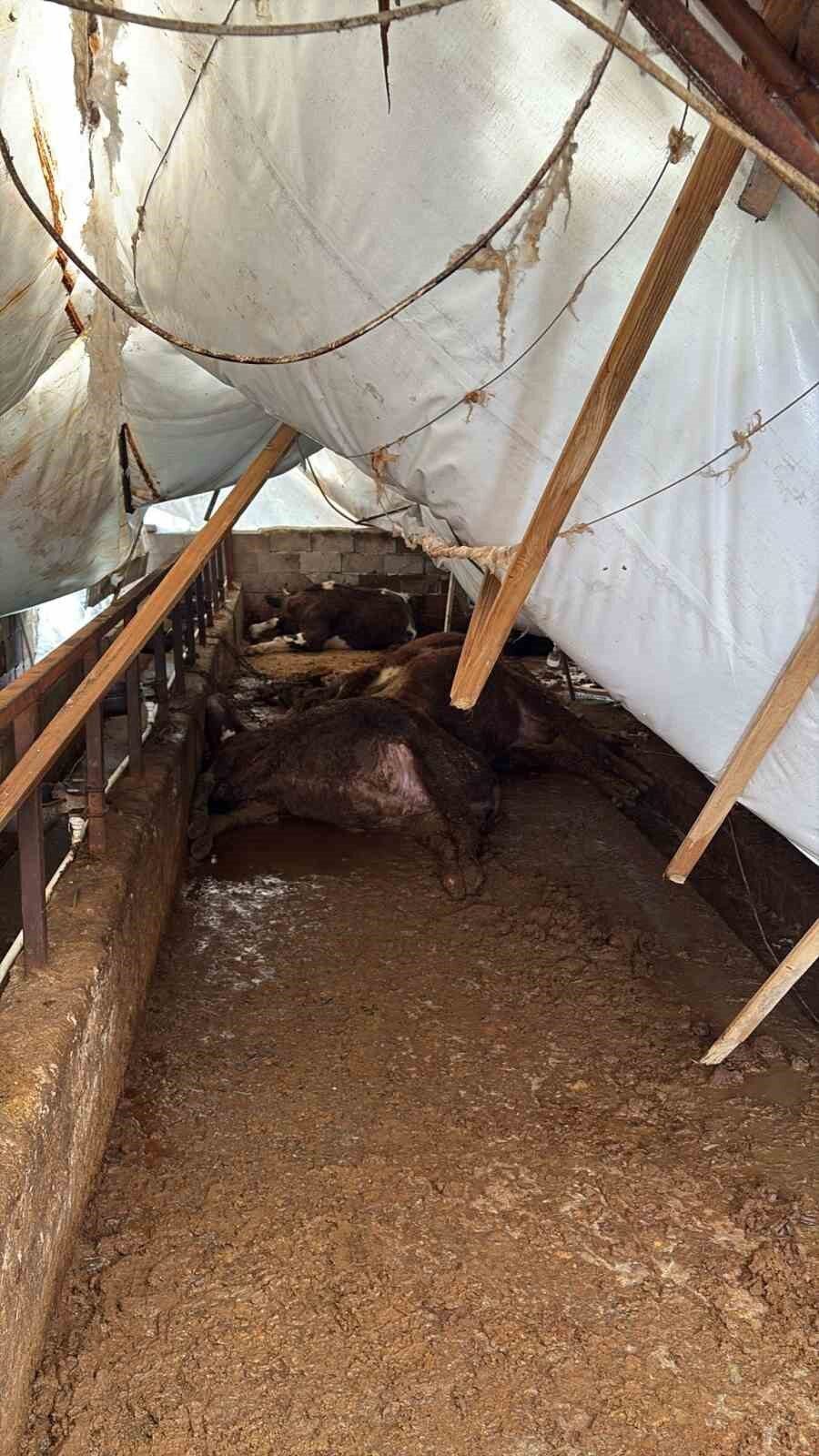 **Karabük’te etkili olan yoğun kar yağışı nedeniyle üzeri çadırla kaplı ahırlar çöktü.** Merkez ilçede yaşanan olayda 7 büyükbaş hayvan telef olurken, Safranbolu’da bir ahırda bulunan 15 küçükbaş hayvan son anda kurtarıldı.