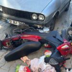 Karaman’da meydana gelen trafik kazasında, otomobil ile çarpışan motosikletin sürücüsü yaralanırken, poşetler içindeki sebzeler yola döküldü.
