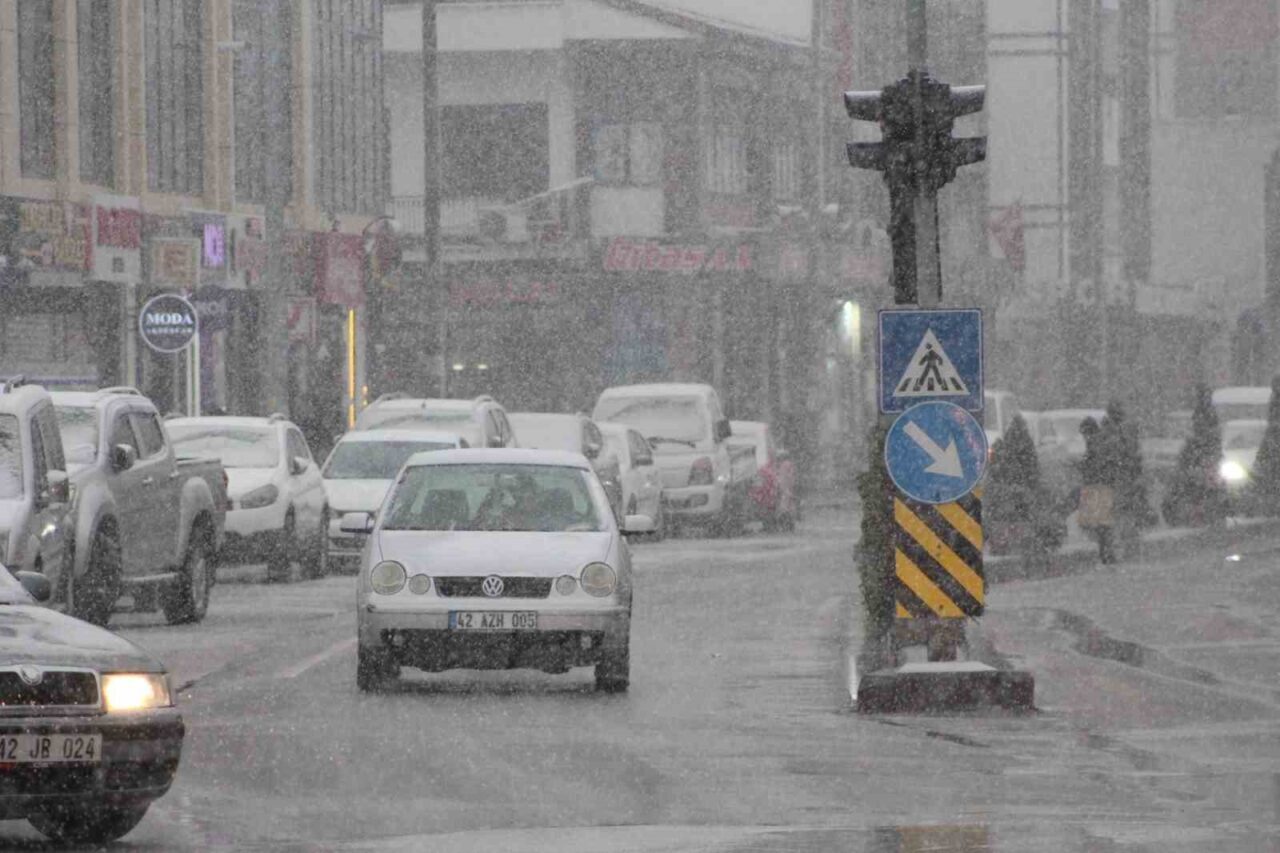 Karapınar’da yılın son günü başlayan kar yağışı, ilçeyi beyaz örtüyle kapladı.