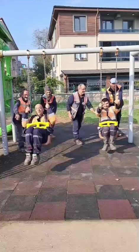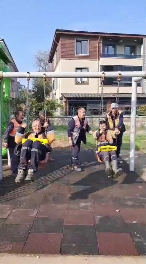 Araya giren bir molada, belediye çalışanları çocuk parkına doğru yöneldiler. Parkta salıncakta oturan işçiler, arkadaşlarını sallayarak eğlenceli dakikalar geçirdi. Bazı işçilerin salıncağın üzerinde yükseğe çıkma çabaları, hem keyifli anların hem de kahkahaların artmasına neden oldu. Yoğun iş programları arasında kısa bir nefes almak için buldukları bu fırsatta, “içlerindeki çocuğu” gözler önüne seren işçilerin bu görüntüleri, oldukça hareketli ve renkli anlar oluşturdu.