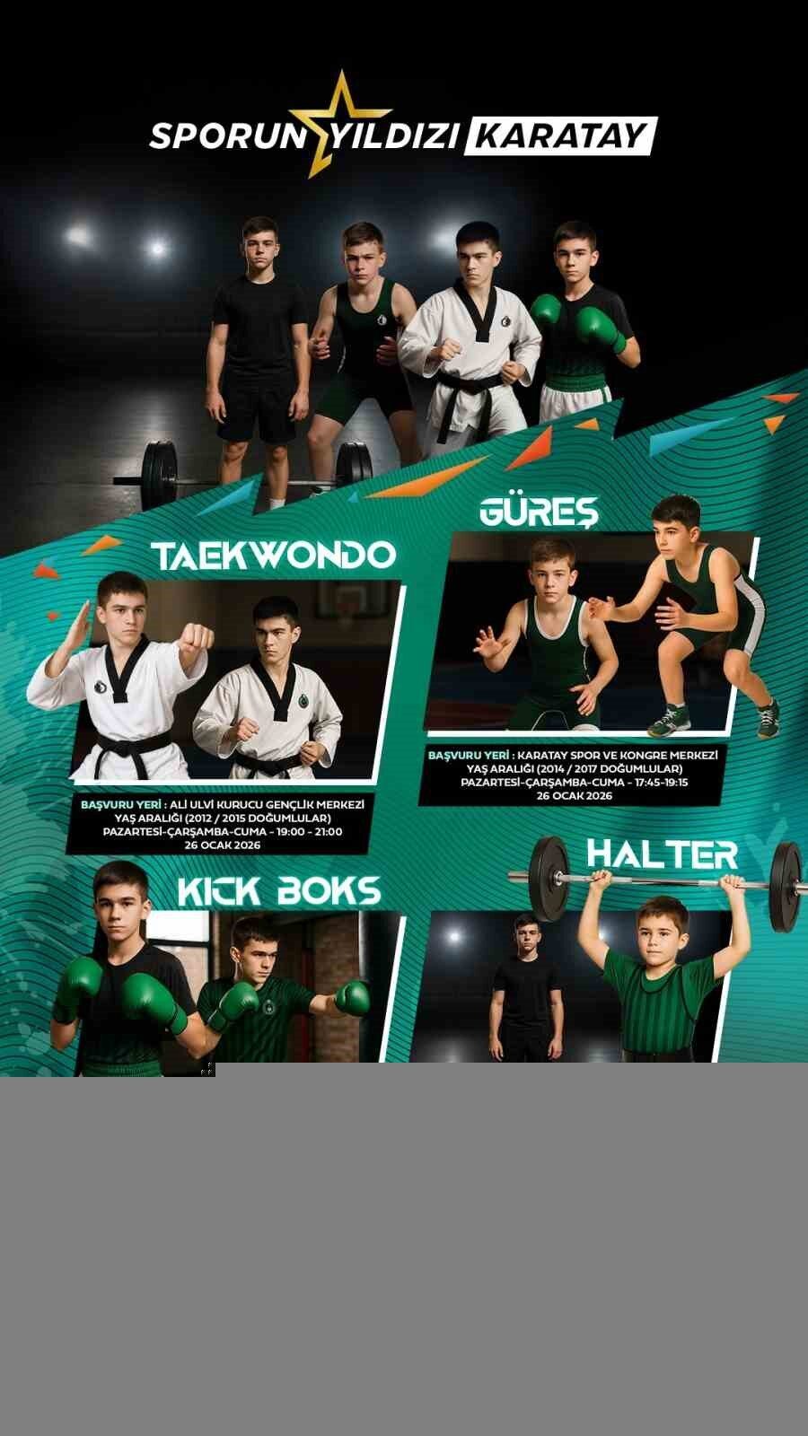 Karatay Belediyespor Kulübü, “Sporun Yıldızı Karatay” projesi çerçevesinde 2012-2017 doğumlu ortaokul öğrencilerine yönelik taekwondo, güreş, kick boks ve halter branşlarında yetenek seçmelerine başlayacak.