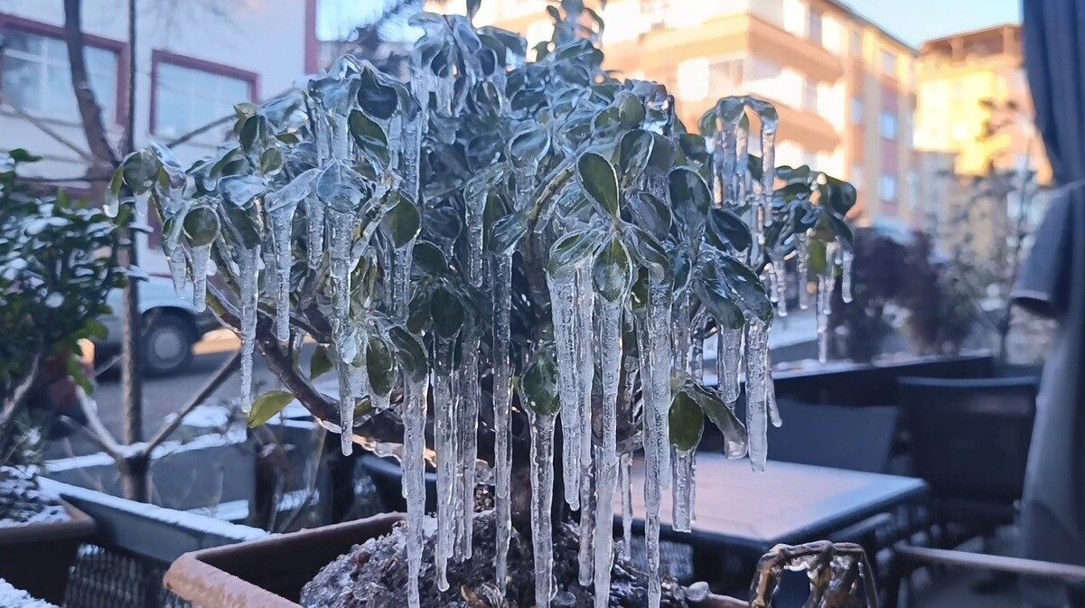 Sibirya soğuklarının etkili olduğu kentte bir iş yerinin kilidi donarken, dükkan önündeki süs bitkisinde de sarkıtlar oluştu.