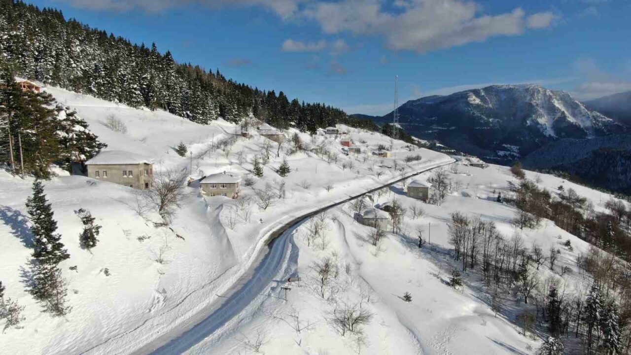 Kastamonu’nun Bozkurt ve Çatalzeytin ilçelerini birbirine bağlayan, İnebolu ile Taşköprü ilçelerinin de kesişim noktasında yer alan Yaralıgöz Dağı, kış mevsiminde adeta bir masal diyarına dönüştü. Kar kalınlığının 1,5 metreyi geçtiği bu dağda kartpostallık görüntüler ortaya çıktı. Dağda bulunan ahşap evler de karla kaplandı. Fotoğraf tutkunları için adeta bir açık hava stüdyosu haline gelen Yaralıgöz Dağı, havadan görüntülendi.