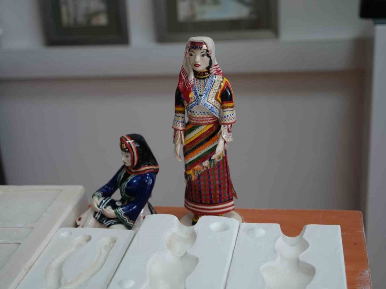 Yaklaşık 28 santimetre boyutundaki biblo, Kastamonu’nun Azdavay ve Pınarbaşı ilçelerine özgü yöresel kadın kıyafetlerini minyatür ölçekte başarılı bir şekilde yansıtıyor. Biblo tasarımında şal desenli başörtüsü, işlemeli cepken, entari ve geleneksel önlük gibi unsurlar ön plana çıkarken, figür, seramik formunda bir kaide üzerinde ayakta duran kadın figürü olarak tasarlandı. El ve kalıpta biçimlendirme teknikleriyle üretilen biblo, sır altı dekor tekniğiyle hazırlanarak bin 50 derecede sırlı pişirime tabi tutuluyor. Ardından sır üzerine 750 derecede altın yaldız dekor uygulanarak son hali veriliyor. Sanatsal detayların titizlikle işlendiği bebekler hem dekoratif obje hem de kültürel temsil aracı olarak öne çıkıyor.
