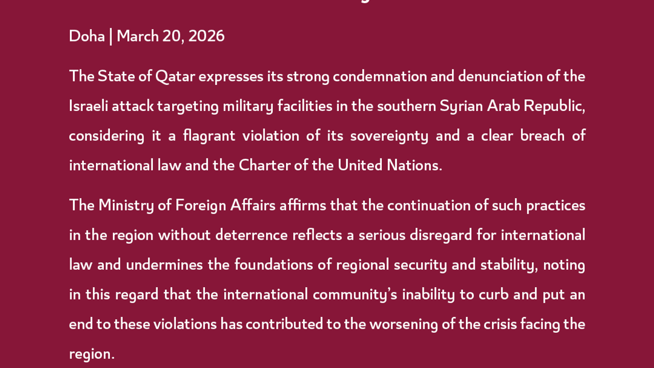 Katar Dışişleri Bakanlığı, İsrail'in Suriye'deki askeri tesislere yönelik gerçekleştirdiği saldırıları kuvvetle kınadı. Yapılan açıklamada, “Bu eylemleri, Suriye'nin egemenliği ve uluslararası hukuk ile BM Sözleşmesi'nin belirgin bir ihlali olarak değerlendiriyoruz” denildi. Ayrıca, bu tür saldırıların uluslararası hukuka yönelik bir saygısızlık olduğunu ve bölgesel güvenlik ile istikrarı tehdit ettiğini belirtti. Katar, Suriye hükümetiyle dayanışma içinde olduklarını ve ülkenin egemenliğini koruma çabalarına destek vereceklerini ifade etti.