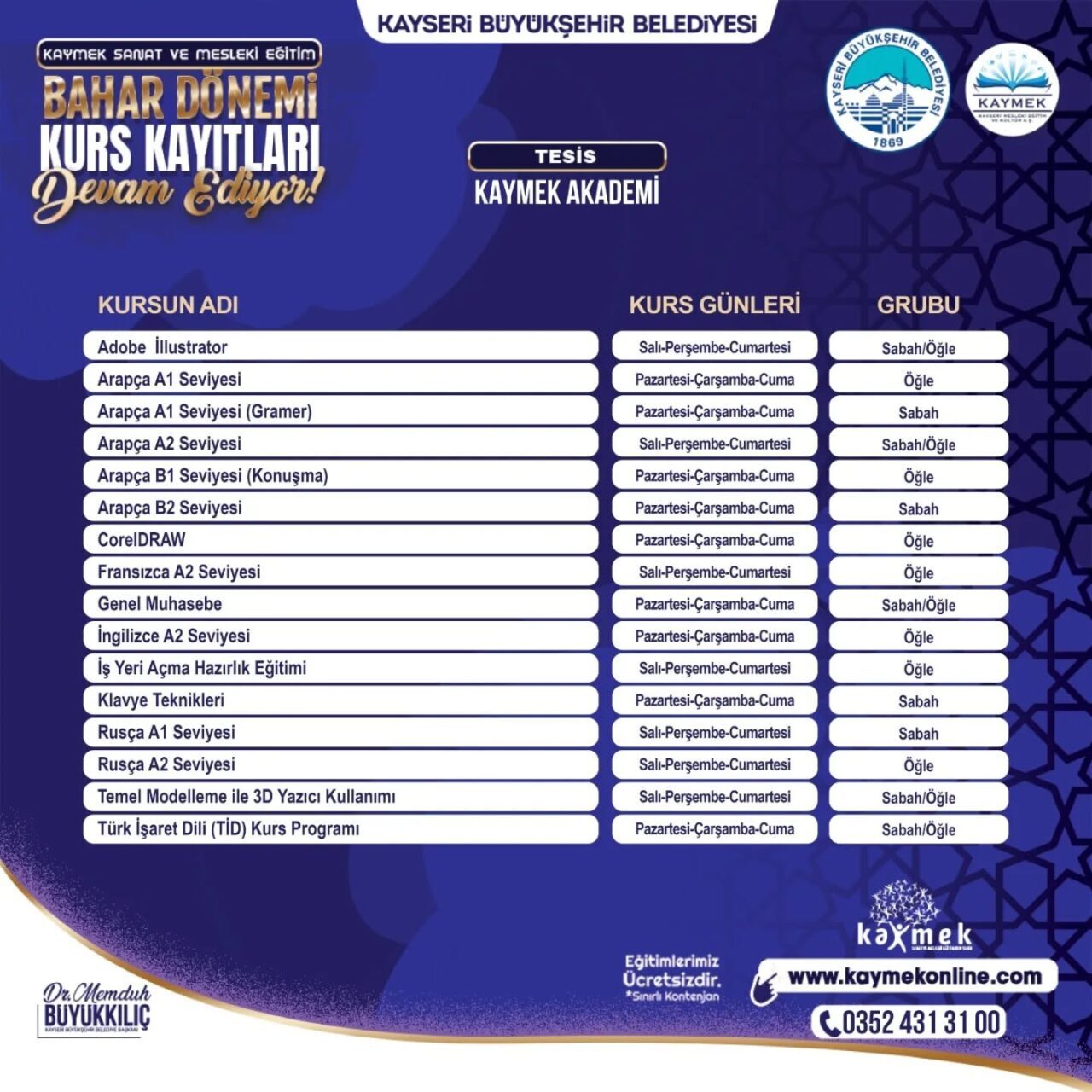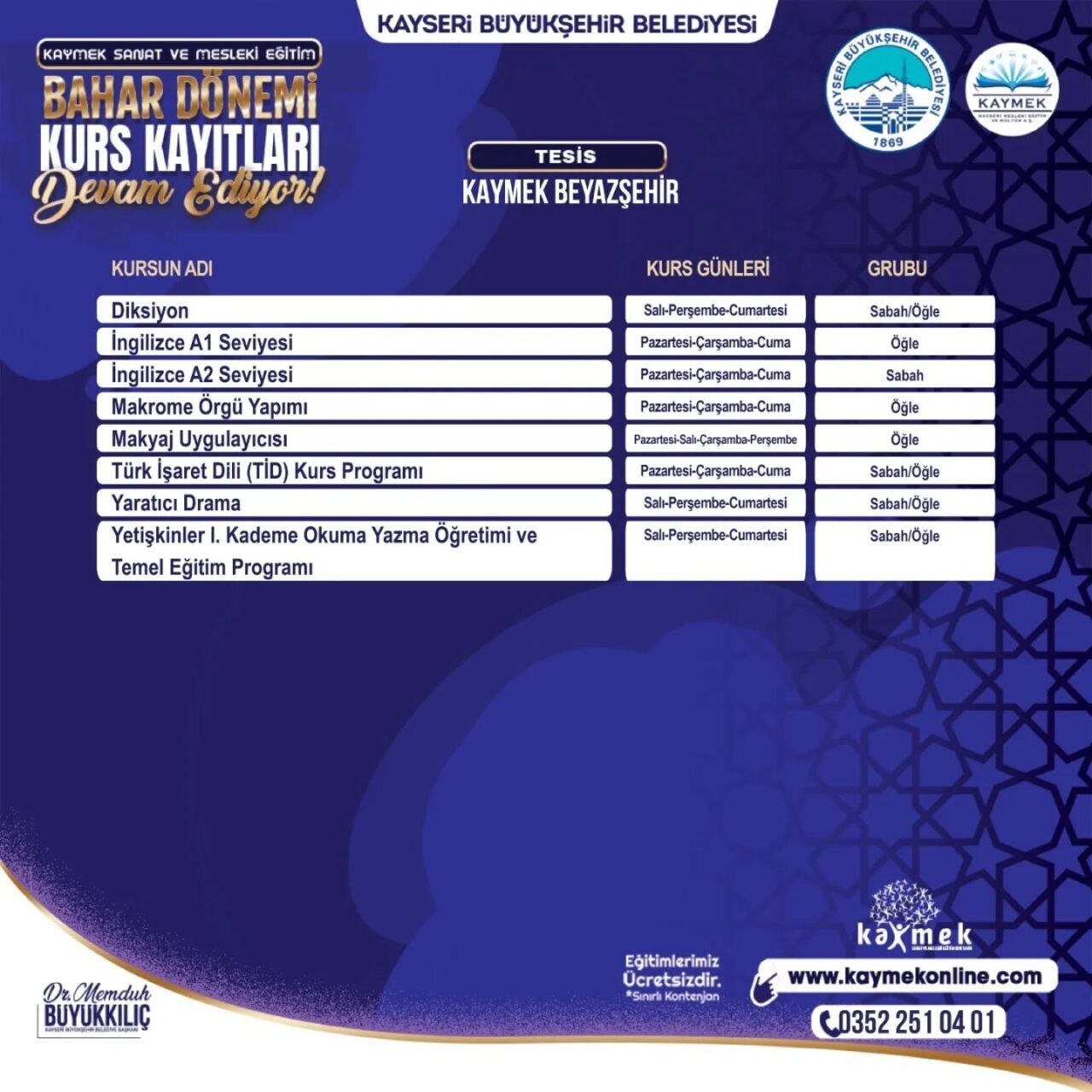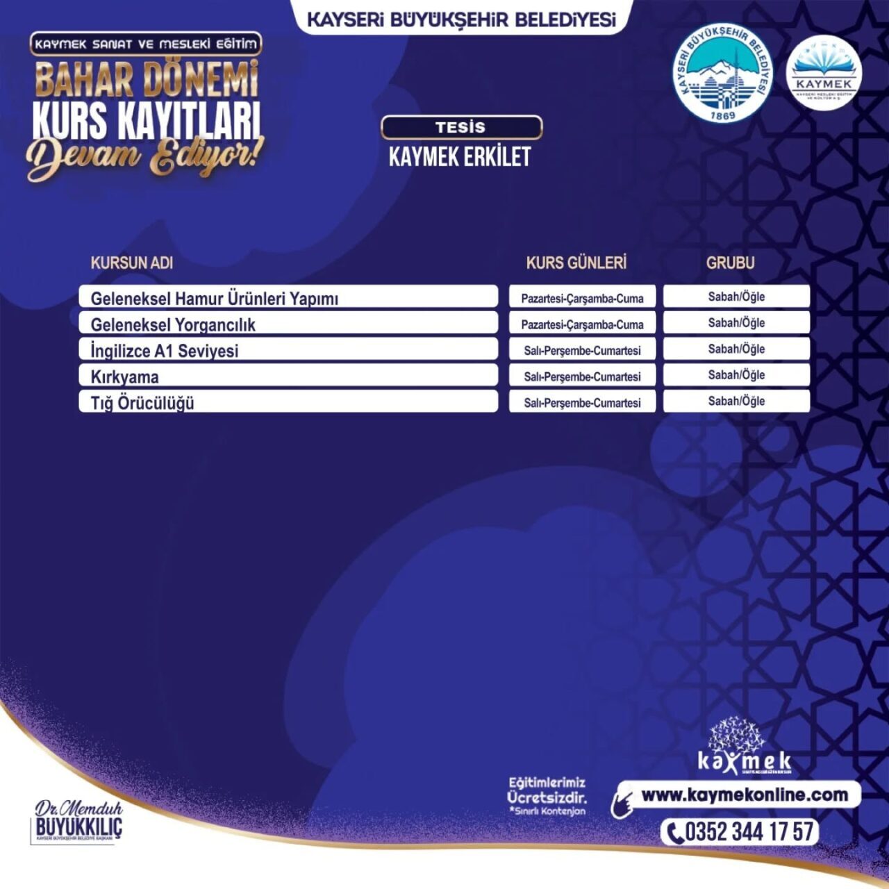 Kayseri’deki 6. üniversite olarak faaliyet gösteren KAYMEK, yeni yılda da hizmetlerine hız kesmeden devam ediyor. Bu kapsamda çocuklar ve gençler başta olmak üzere her yaş grubundan bireylere yönelik kaliteli ve zengin içeriklere sahip geniş bir kurs çeşitliliği ile her yıl yüz binlerce insana ulaşan KAYMEK’in 12 Ocak’ta başlattığı Sanat ve Mesleki Eğitim Bahar Dönemi kurs kayıtlarına müracaatlar sürüyor. KAYMEK’in alanında uzman eğitmenleri tarafından tamamen ücretsiz olarak sunulacak ve kontenjanları sınırlı olan kurslar için kayıt işlemleri www.kaymekonline.com internet adresi üzerinden gerçekleştirilebilecek. Kurslar hakkında detaylı bilgiye de bu internet adresinden ve 0 352 231 80 31 numaralı telefon aracılığıyla erişebilecek vatandaşlar, 1 Şubat 2026 tarihine kadar kayıt işlemlerini tamamlayabilir.
