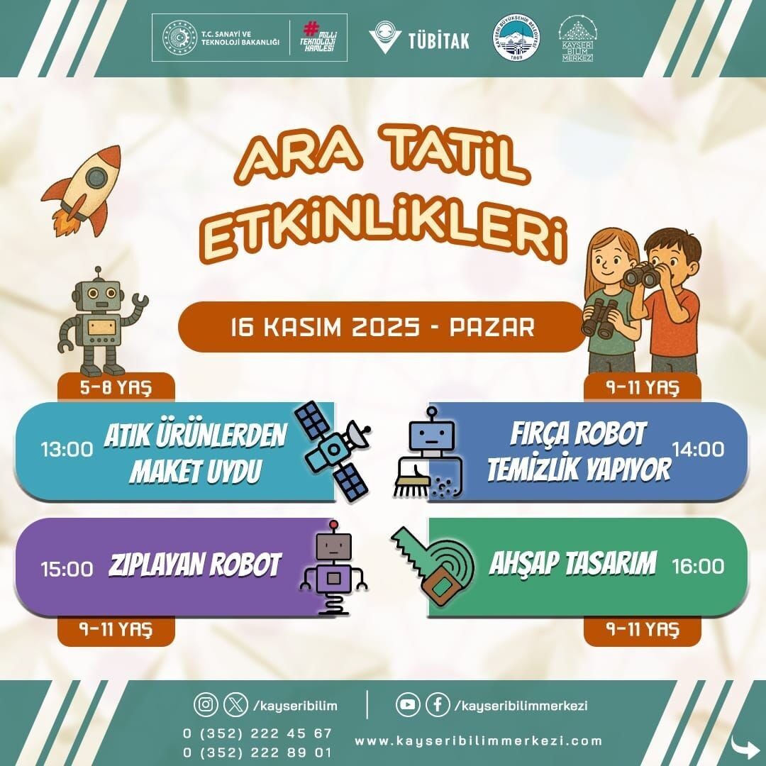 Kayseri Büyükşehir Belediyesi, bilimin eğlenceli ve keşif dolu dünyasını deneyimlemek isteyen tüm öğrencilere Kayseri Bilim Merkezi’ne davet ediyor. Ara tatilde öğrenmek, keşfetmek ve eğlenmek isteyen çocuklar için eşsiz bir fırsat sunuluyor. Ayrıntılı bilgi ve kayıt işlemleri için Kayseri Bilim Merkezi’nin sosyal medya hesaplarından takip edebilirsiniz.
