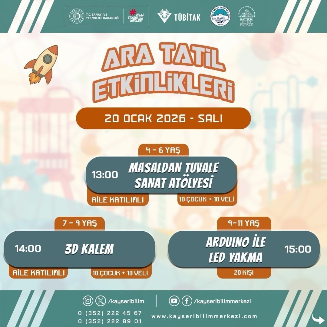 Yarıyıl tatilinde bilim, sanat ve teknolojiyi bir araya getirecek olan Kayseri Bilim Merkezi, öğrencilere çeşitli ve ilgi çekici etkinlikler sunacak. Ziyaretçilerine 20-30 Ocak 2026 tarihleri arasında bu anlamda kapılarını açacak olan merkezde, bilimsel deneyler, atölyeler ve teknoloji temelli etkinlikler yer alacak. Programa katılımın kontenjanlarla sınırlı olduğu belirtilirken, birbirinden güzel etkinlikler çocukları bekliyor.