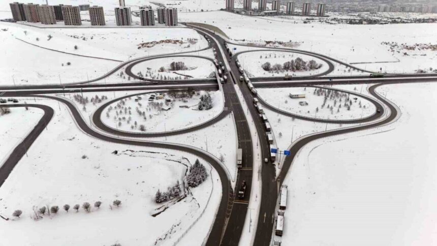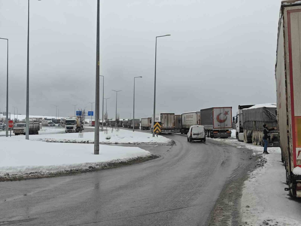 Kayseri’de kar nedeniyle bazı yollar tır trafiğine kapandı, bekleyen araçlar sınır kapısını andırdı.