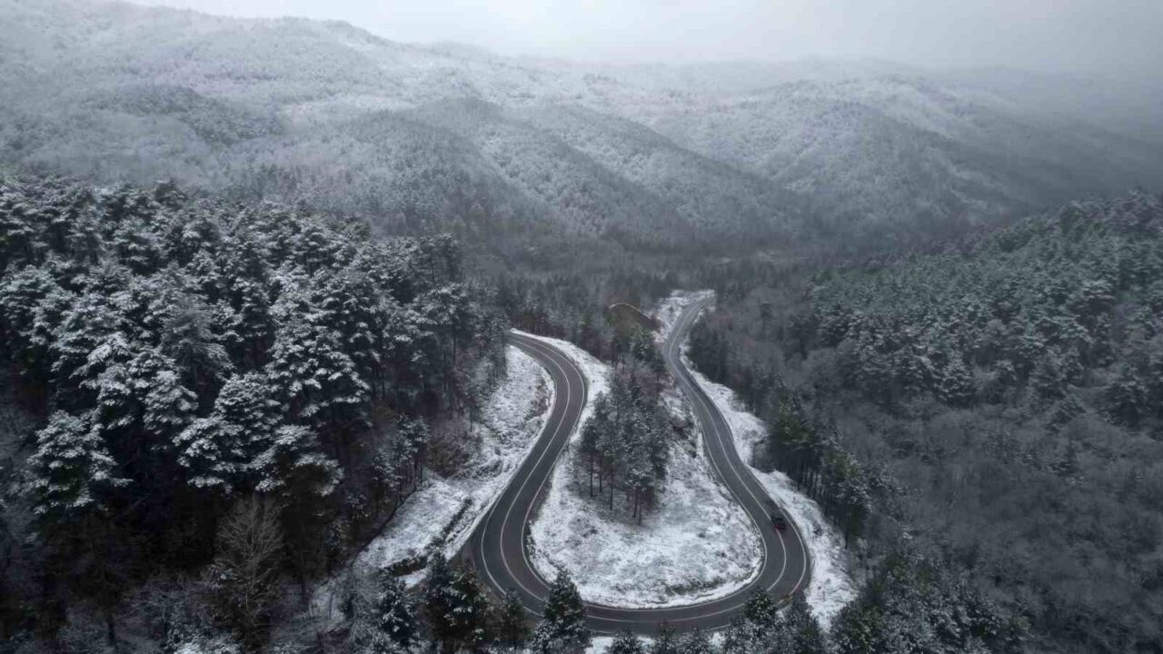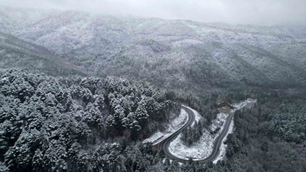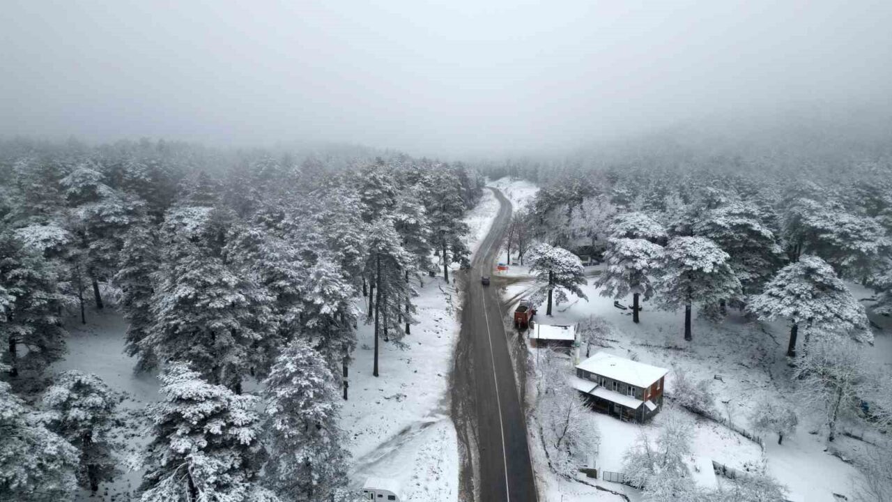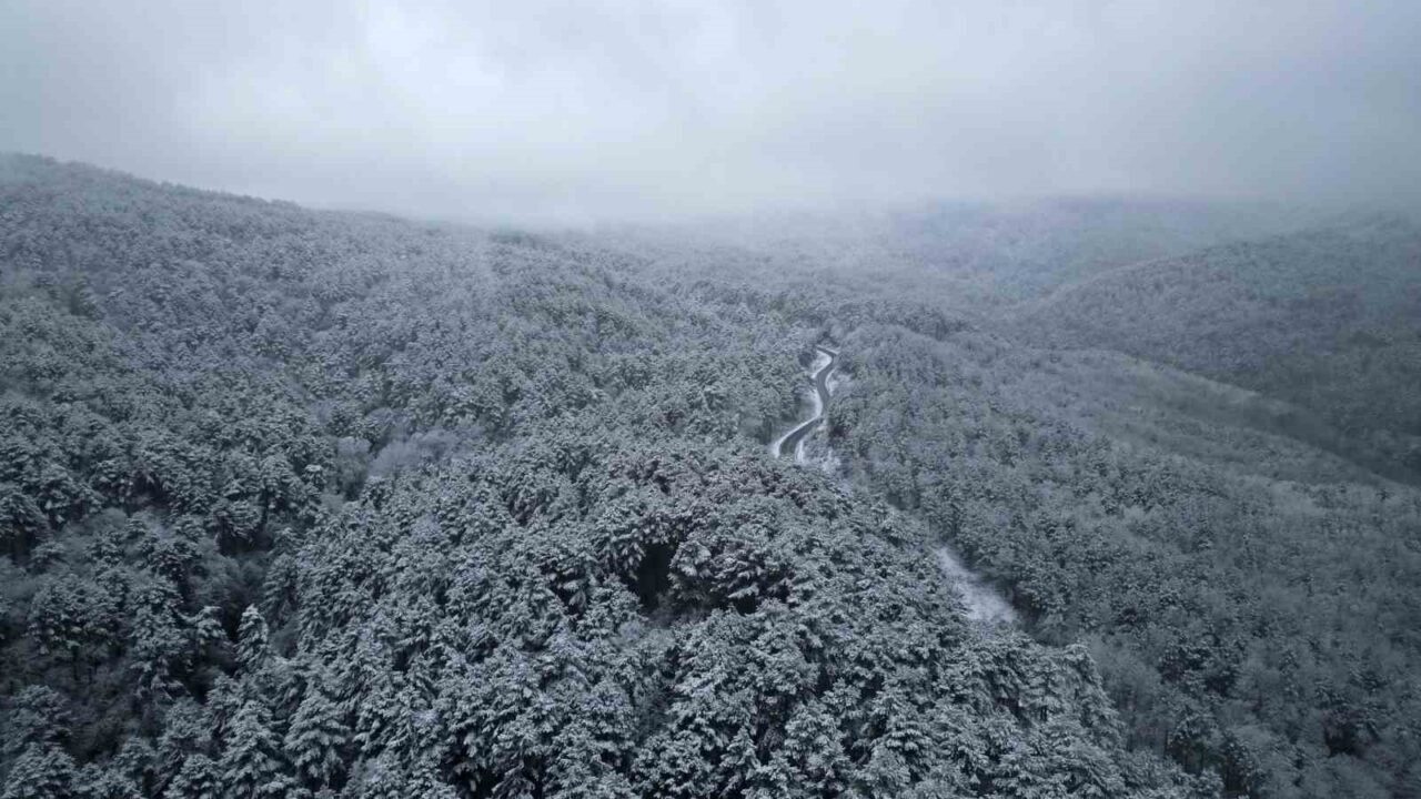 Marmara ile Ege Bölgesi’ni fiziki olarak ayıran Kazdağları’nda etkili olan kar yağışı sonrası ortaya çıkan beyaz şölen havadan görüntülendi.