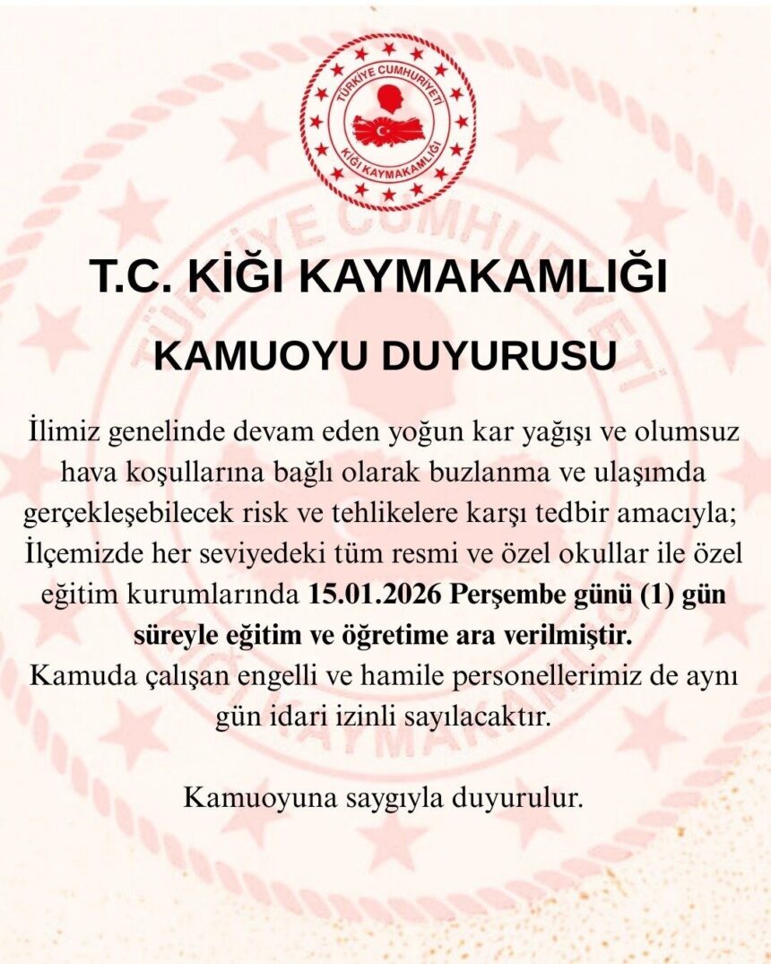 Kiğı’da meydana gelen kar yağışının ardından, aşırı buzlanma ve don olayları devam etmekte. Bu kapsamda Kiğı kaymakamlığı tarafından yapılan açıklamada, buzlanma ve ulaşımda yaşanacak olumsuzluklar dolayısıyla, 15 Ocak 2026 Perşembe günü ilçe genelinde eğitim ve öğretime 1 gün süreyle ara verildiği belirtildi. Ayrıca, aynı gün kamu kurumlarında çalışan hamile ve engelli personellerin idari izinli sayılacağı da açıklandı.