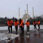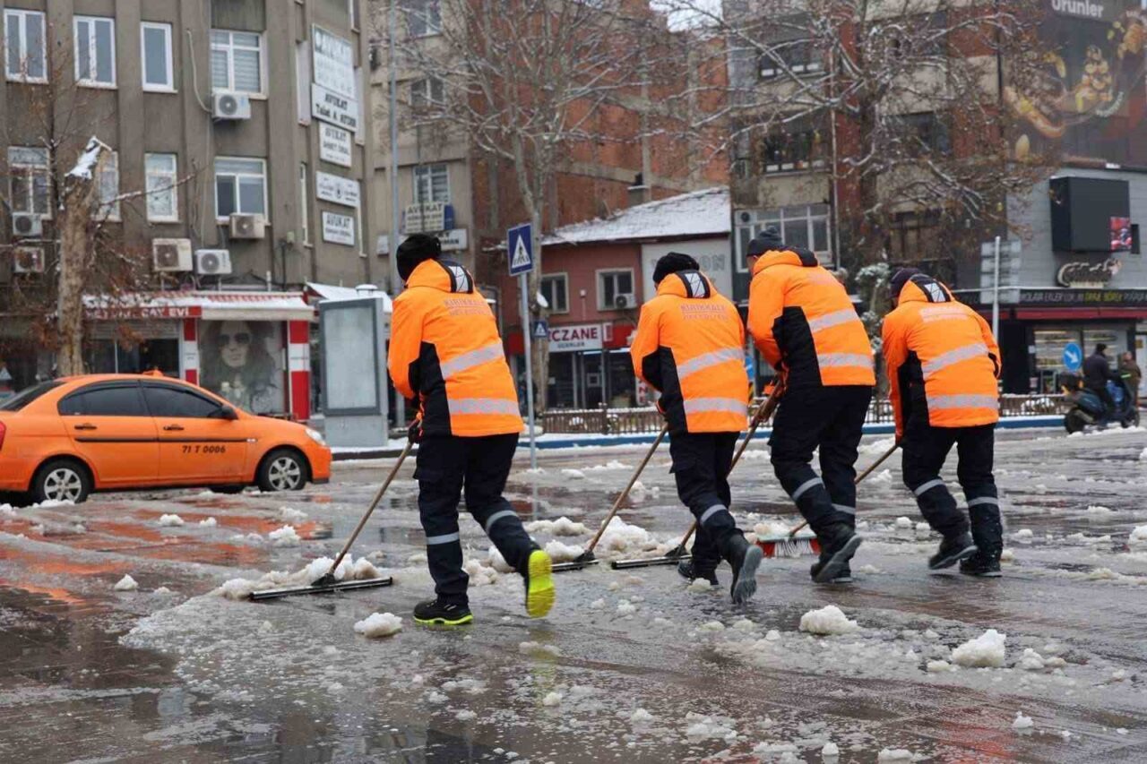 Kırıkkale Belediyesi ekipleri, kar yağışının ardından kaldırımlarda biriken karları temizleyerek yaya ulaşımının güvenli şekilde sürmesini sağlıyor.