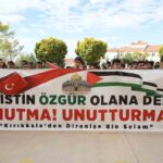 Kırıkkale’deki öğrenciler, düzenledikleri etkinlikte Türk ve Filistin bayraklarıyla birlikte “Özgür Gazze” yazısını bedenleriyle oluşturarak İsrail’in saldırılarını protesto etti.