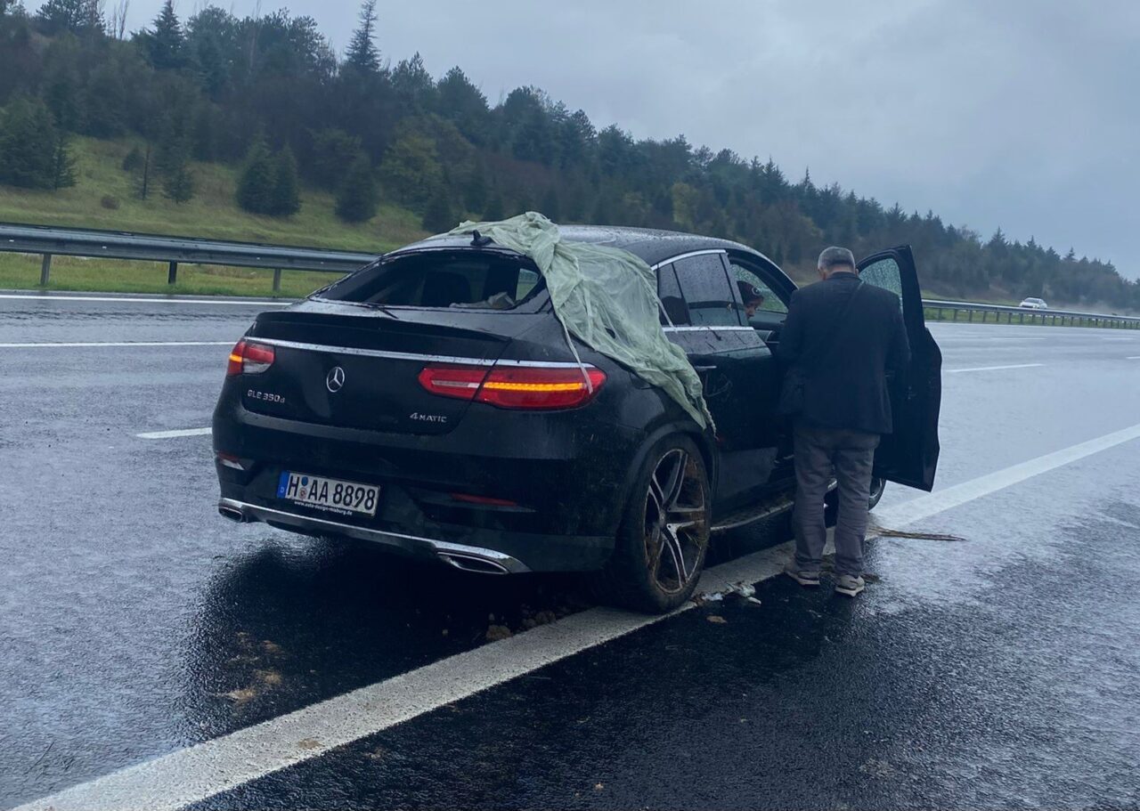 Yoğun yağış esnasında, sürücüsünün kimliği henüz tespit edilemeyen bir Mercedes otomobil, azalan görüş mesafesi nedeniyle önünde seyreden bir tıra arkadan çarptı ve takla attı. Kazanın sonucunda otomobilin ön tarafında ciddi maddi hasarlar oluşurken, durumdan haberdar olan sağlık ekipleri olay yerine yönlendirildi. Neyse ki kazada yaralanan kimsenin olmaması, herkese rahat bir nefes aldırdı.