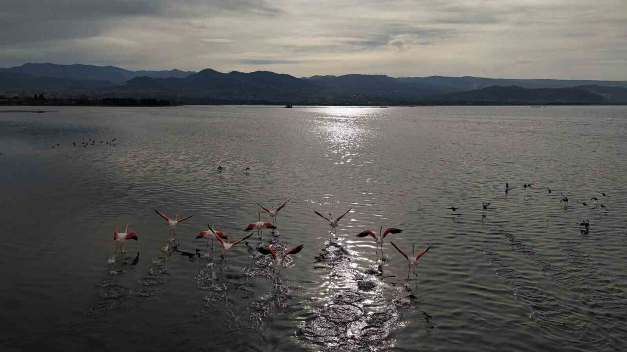 Yaklaşık 168 kuş türüne ev sahipliği yaparak Türkiye’nin önemli kuş gözlem alanlarından biri olma özelliğini sürdüren İzmit Körfezi, kış aylarına rağmen flamingoları ağırlıyor.