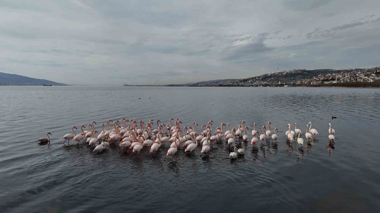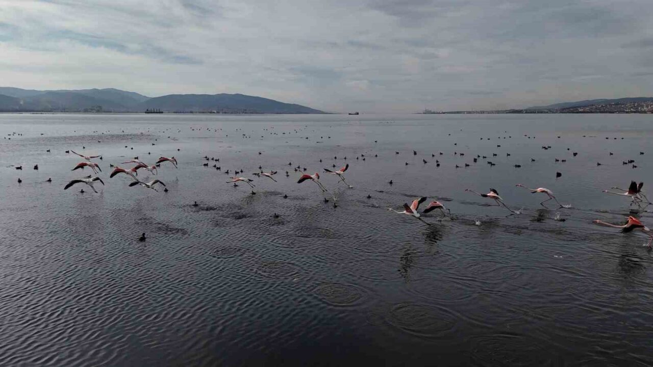 Yaklaşık 168 kuş türüne ev sahipliği yaparak Türkiye’nin önemli kuş gözlem alanlarından biri olma özelliğini sürdüren İzmit Körfezi, kış aylarına rağmen flamingoları ağırlıyor.